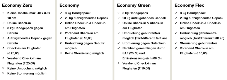 Derweil gibt es auf Condors anderen anderen Flügen zu Kurz-, Mittel- und Langstreckenzielen künftig weiterhin den Tarif, der nur eine kleine Tasche enthält. Der heißt jetzt aber nicht mehr Economy Light, sondern Economy Zero.