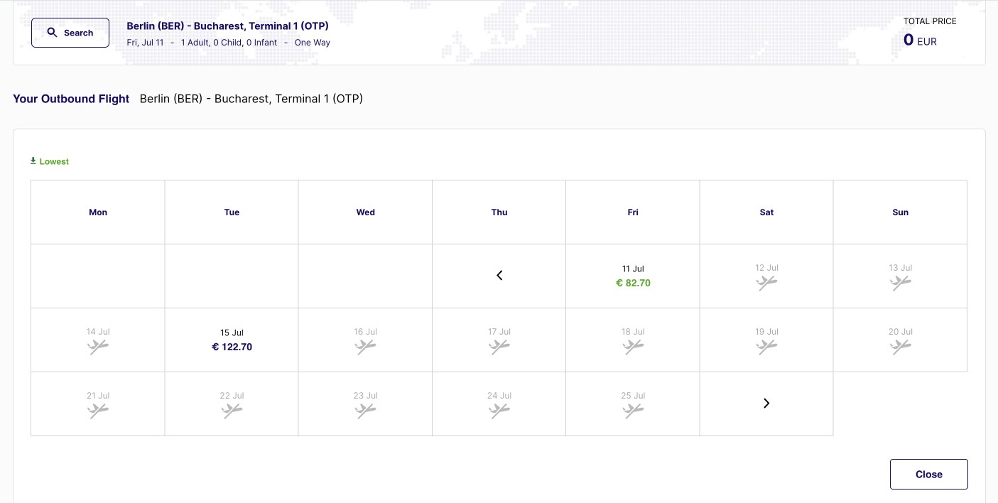Buchungssystem auf der Webseite von Dan Air: Berlin-Flüge nur bis zum 15. Juli. Screenshot danair.ro