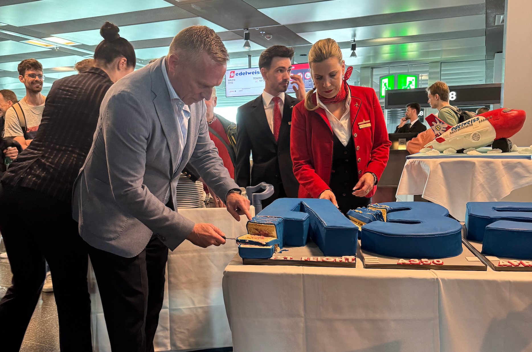 Edelweiss-Chef Bernd Bauer schneidet die Torte an. (Foto: Julie Knappe/aeroTELEGRAPH) Julie Knappe/aeroTELEGRAPH