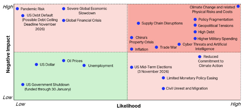 Der Airline-Dachverband zeigt in einer Grafik noch weitere Risiken. Die Rechtsachse zeigt die Wahrscheinlichkeit an, die Hochachse die Schwere negativer Auswirkungen:
