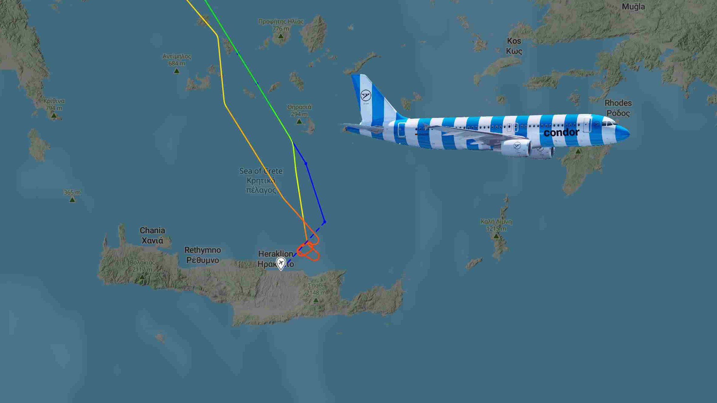 Mit Sicherheit wollten das auch nicht die 137 Passagiere und sechs Crewmitglieder, die am 24. Mai mit Condor-Flug DE1234 von Zürich nach Heraklion flogen. Der Airbus A320 mit der Kennung D-AICA hob um 6:50 Uhr in Zürich ab. Nach rund zwei Stunden in der Luft verließ er die Reiseflughöhe und startete mit dem Anflug auf Heraklion, wie Daten Flugverfolgungsdienstes Airnav Radar zeigen.