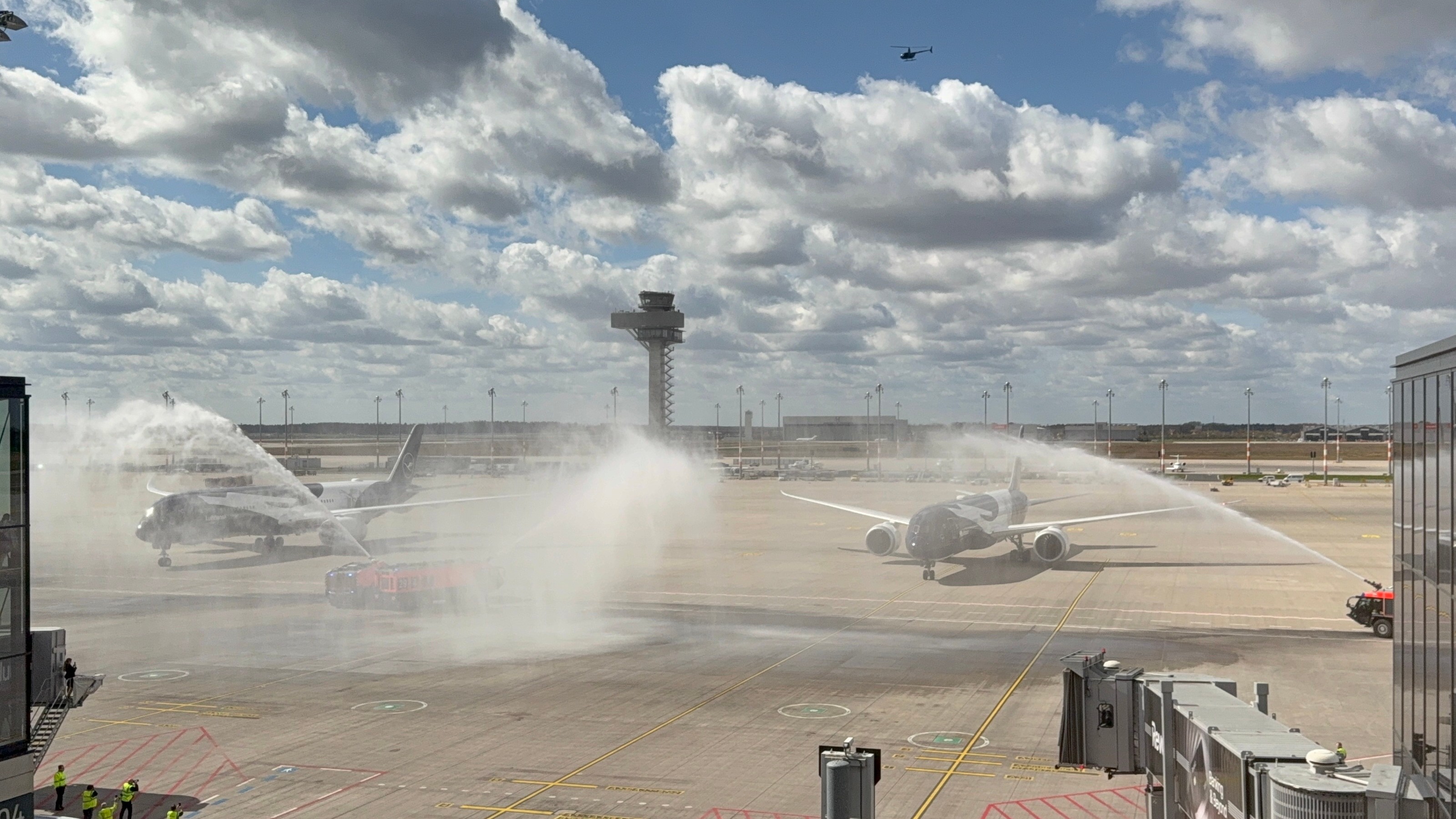 Die Gäste haben da bereits einen Höhepunkt erlebt. Die Boeing 787-9 von Sonderflug LH1926 und der Airbus A350 des gleichzeitig stattfindenden Sonderfluges LH2026 nach Köln/Bonn sind zuvor aus Frankfurt und München kommend synchron gelandet und synchron zu ihren Gates gerollt. Auf dem Weg dorthin sind sie von der Feuerwehr mit einer Wasserfontäne begrüßt worden.