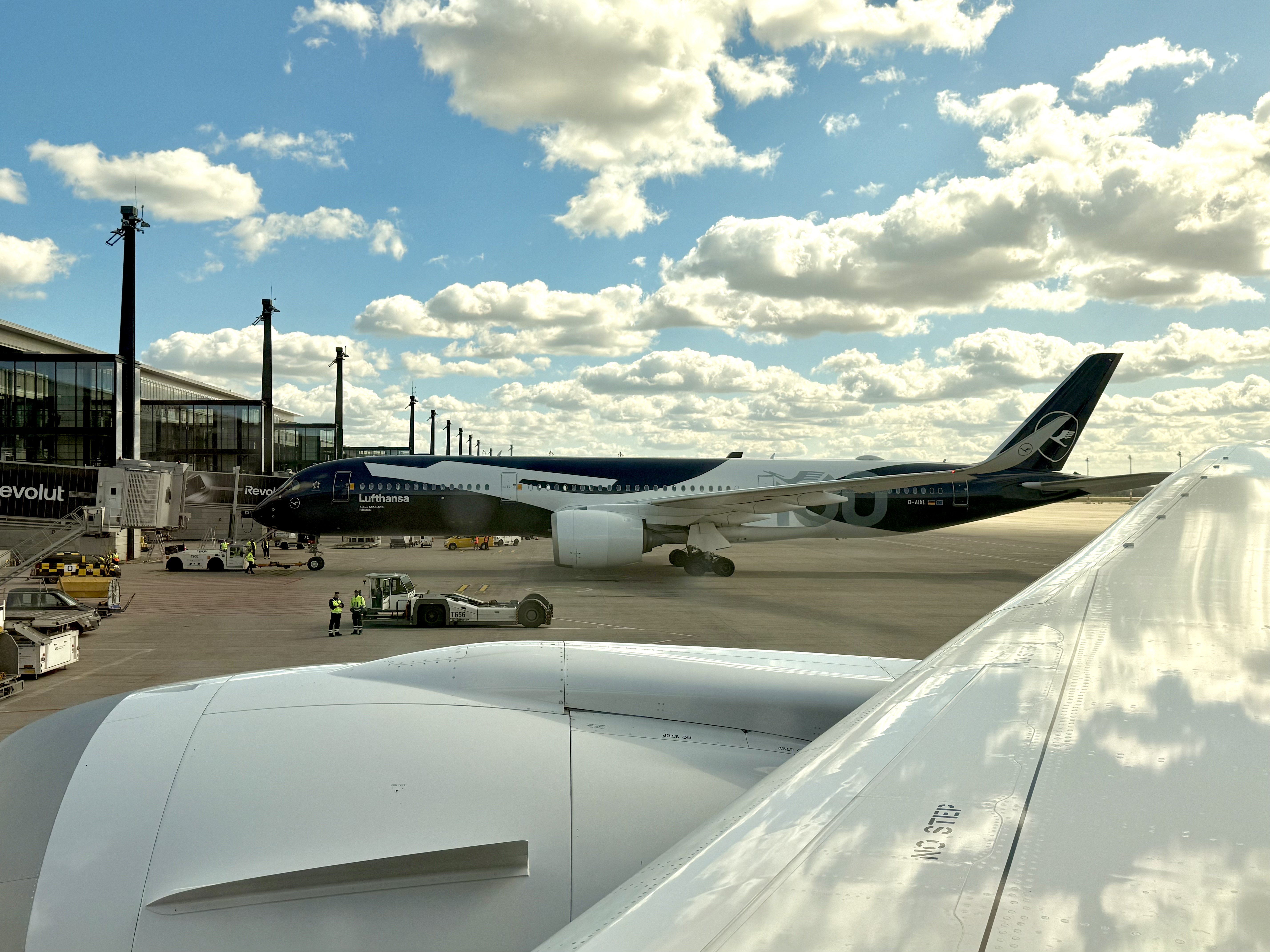 Als der Dreamliner von Flug LH1926 schließlich kurz nach 15 Uhr vom Gate zurückgestoßen wird und auf Startbahn 25L Schub gibt, bietet sich den Passagierinnen und Passagieren und den Schaulustigen am Flughafen Berlin-Brandenburg ein zweites Spektakel. Denn gleichzeitig startet auf der parallelen Piste 25R der Airbus A350 mit dem Kennzeichen D-AIXL als gleichzeitiger Sonderflug gleichzeitig Richtung Köln/Bonn.