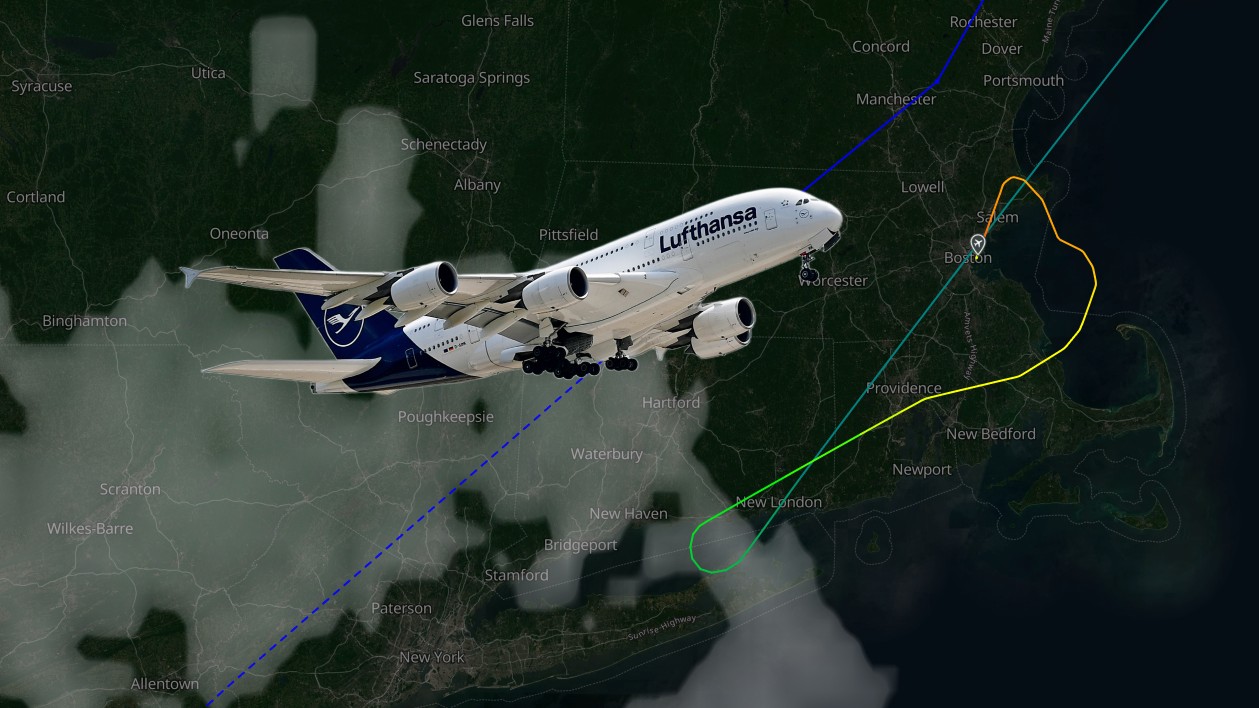 Der Lufthansa-Pilot sagte also, dem A380 würde auf der aktuellen Route der Treibstoff ausgehen für ... - und genau diese Stelle ist nicht zu verstehen. Warum er von der aktuellen Route spricht, zeigt der Flugverfolgungsdienst Airnav Radar. Dort ist zu erkennen, dass der Jet mit dem Kennzeichen D-AIMM schon vorher - über dem Südosten des Bundesstaates Maine - von der ursprünglichen Route abweichen und südlicher fliegen musste.