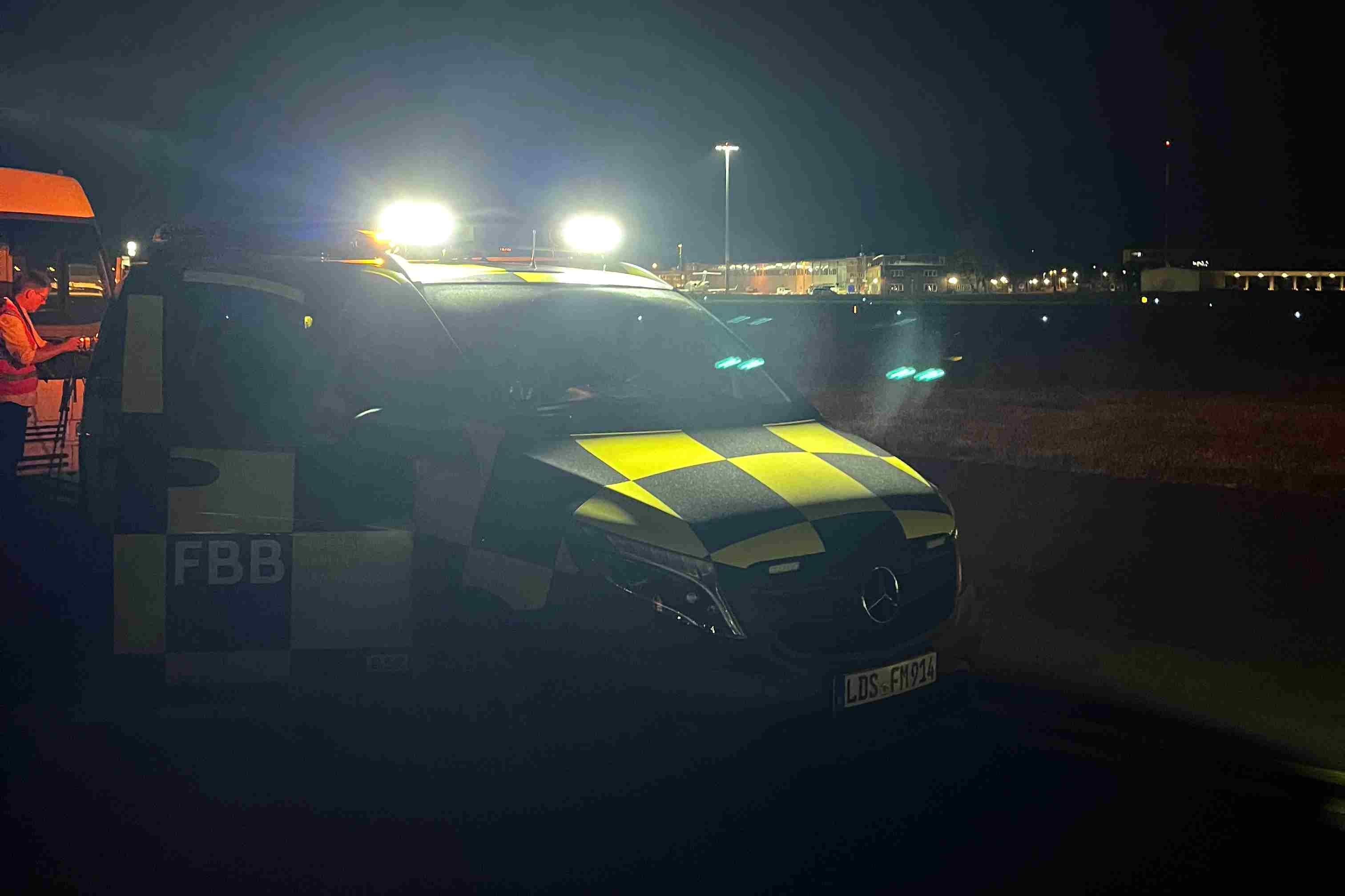Das Follow-Me-Fahrzeug macht die Scheinwerfer an. aeroTELEGRAPH