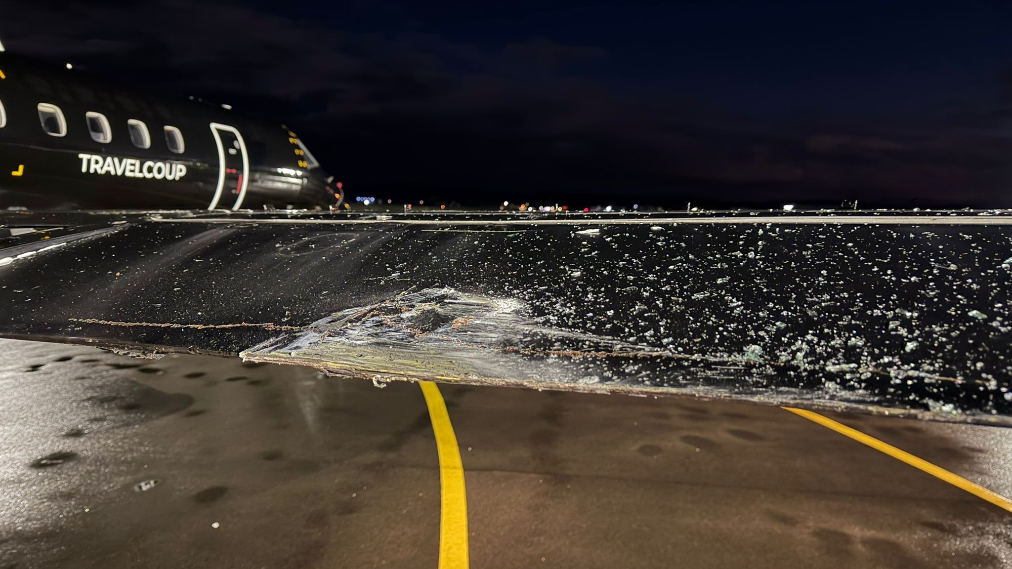 Nun muss Travelcoup auf den Jet mit 16 VIP-Plätzen vorerst verzichten. Am Flughafen Saarbrücken ist es am 2. November zu einer Kollision eines Bodenfahrzeug mit der Embraer gekommen. Bilder, die aeroTELEGRAPH vorliegen, zeigen Schäden an den Tragflächen. Travelcoup teilt mit, kurzfristig auf das Flugzeug verzichten zu müssen. Einige Flüge im Charter- und Semi-Privatjet-Bereich fallen aus.