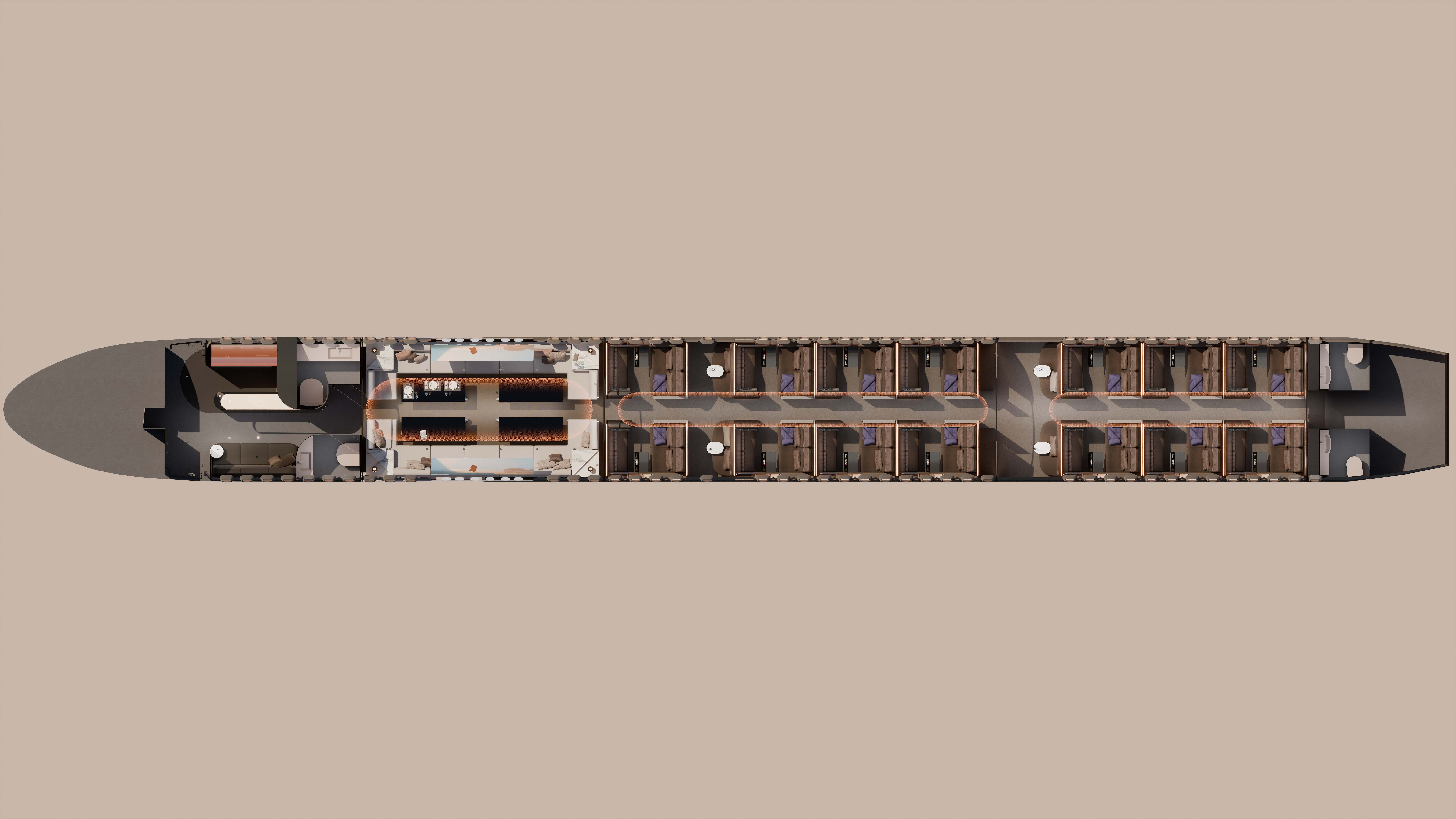 Den Abschluss bilden die «Bow Suites», private Rückzugsräume, die Platz für ein bis zwei Reisende bieten. Sie eignen sich ideal für private Meetings oder gemeinsames Essen und verfügen über persönlichen Stauraum, etwa für Musikinstrumente, professionelles Equipment oder persönliche Gegenstände. Optionale Trennelemente ermöglichen es, die Kabinenatmosphäre vom Rückzugsmodus hin zu einer offenen Struktur zu verändern. Die Kabine bietet Platz für 28 Reisende.