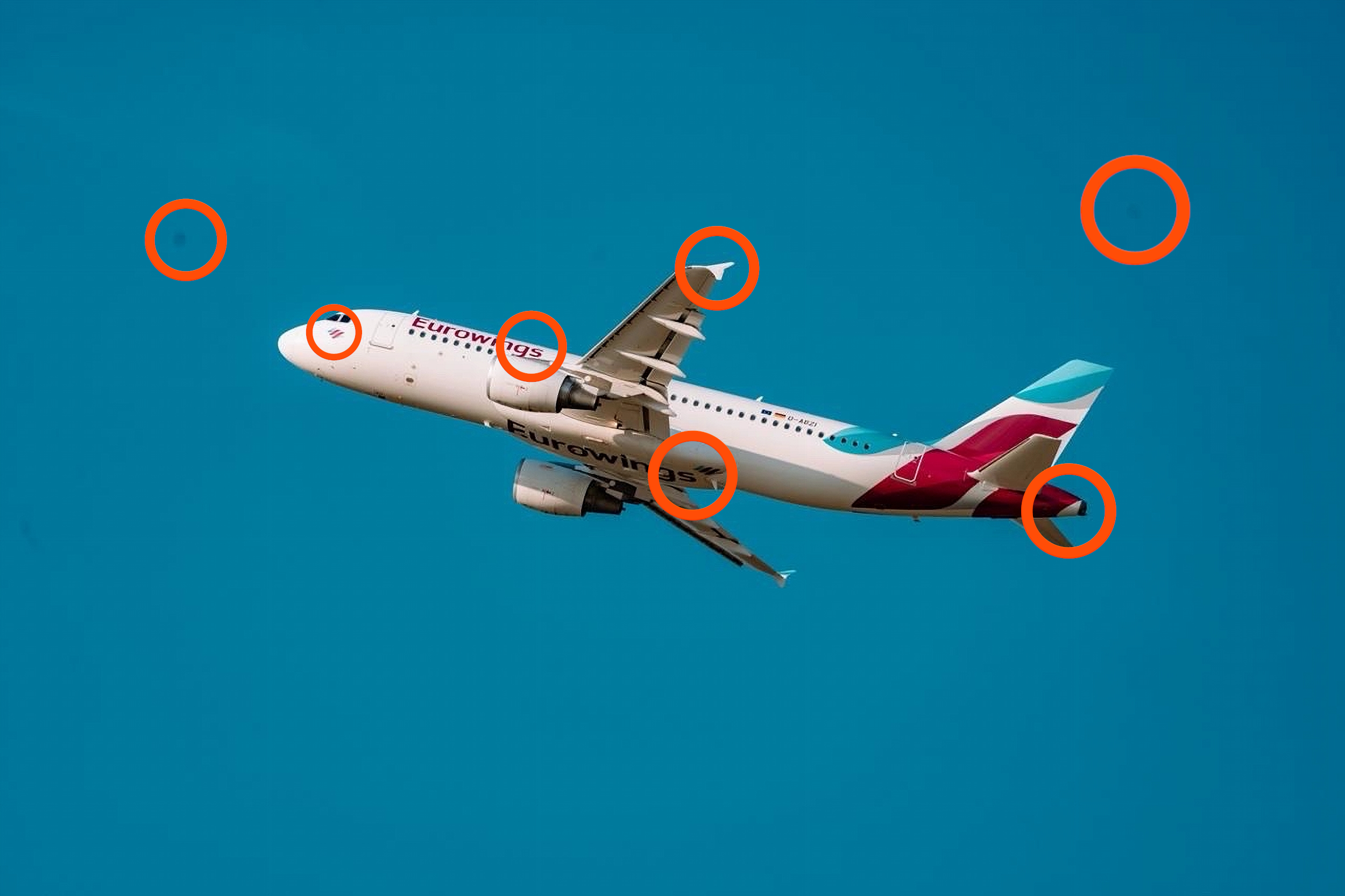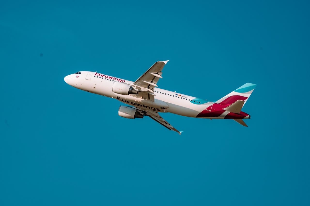 Ein Airbus A320 von Eurowings erhebt sich in die Luft. Er bringt Passagiere zum Urlaubsziel oder holt sie von dort ab. Wir haben das Originalbild dieser Szene kopiert und auf der Kopie sieben Dinge verändert. Finden Sie heraus, welche Details es sind?
