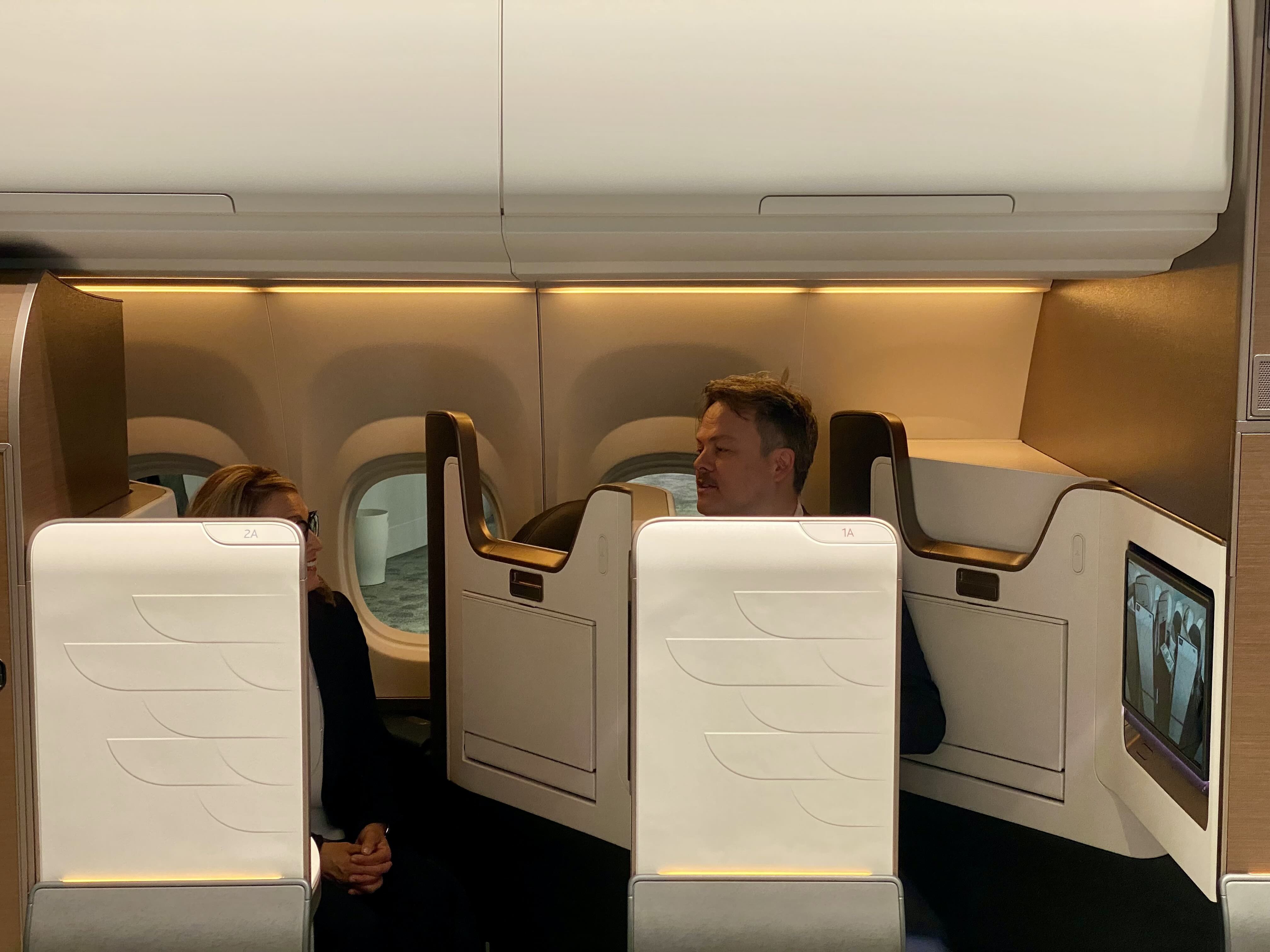 Zwischen den Suiten gibt es kleine Trenner, die sich senken lassen und Gespräche zwischen zwei Suiten ermöglichen. Die 19-Zoll-Monitore werden bei der Nutzung aufgeschwenkt. In der Economy Class sind die Monitore 13 Zoll groß. In beiden Klassen gibt es Bluetooth-Audio.