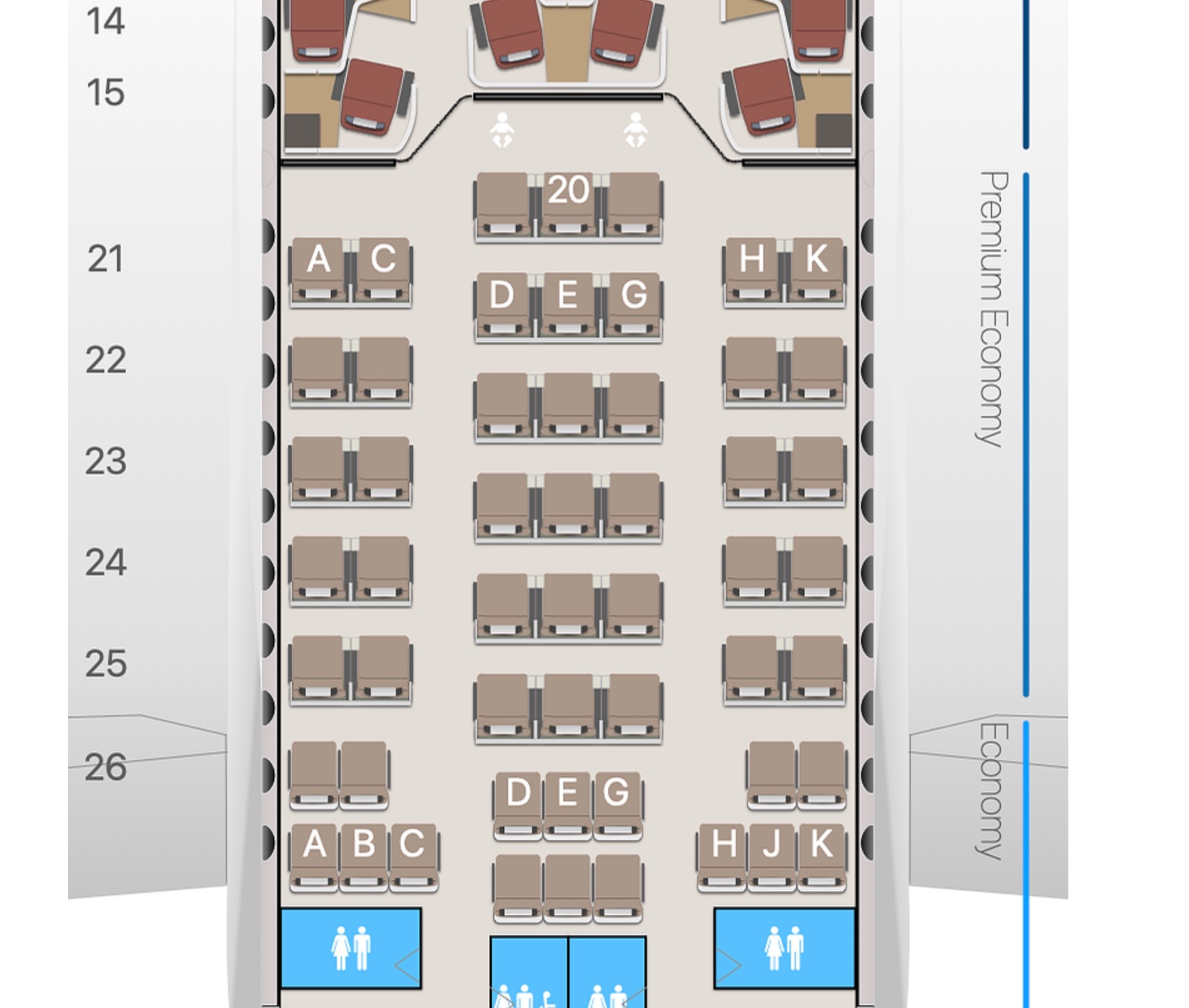 Die Reihen 26 und 27 stehen verloren in der Premium Economy