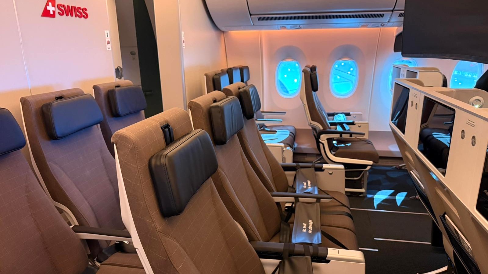 Die beiden ersten Economy-Reihen sind aktuell faktisch aber sogar nur eine. Denn die Plätze in der vordersten darf Swiss - wie auch ihre Schwester Lufthansa im Airbus A350 - noch nicht verkaufen. Denn weil sie vor den Premium Economy-Sitzen mit ihren Hartschalensitzen stehen, braucht es für sie eine zusätzlichen Schutz im Falle einer Bruchlandung.