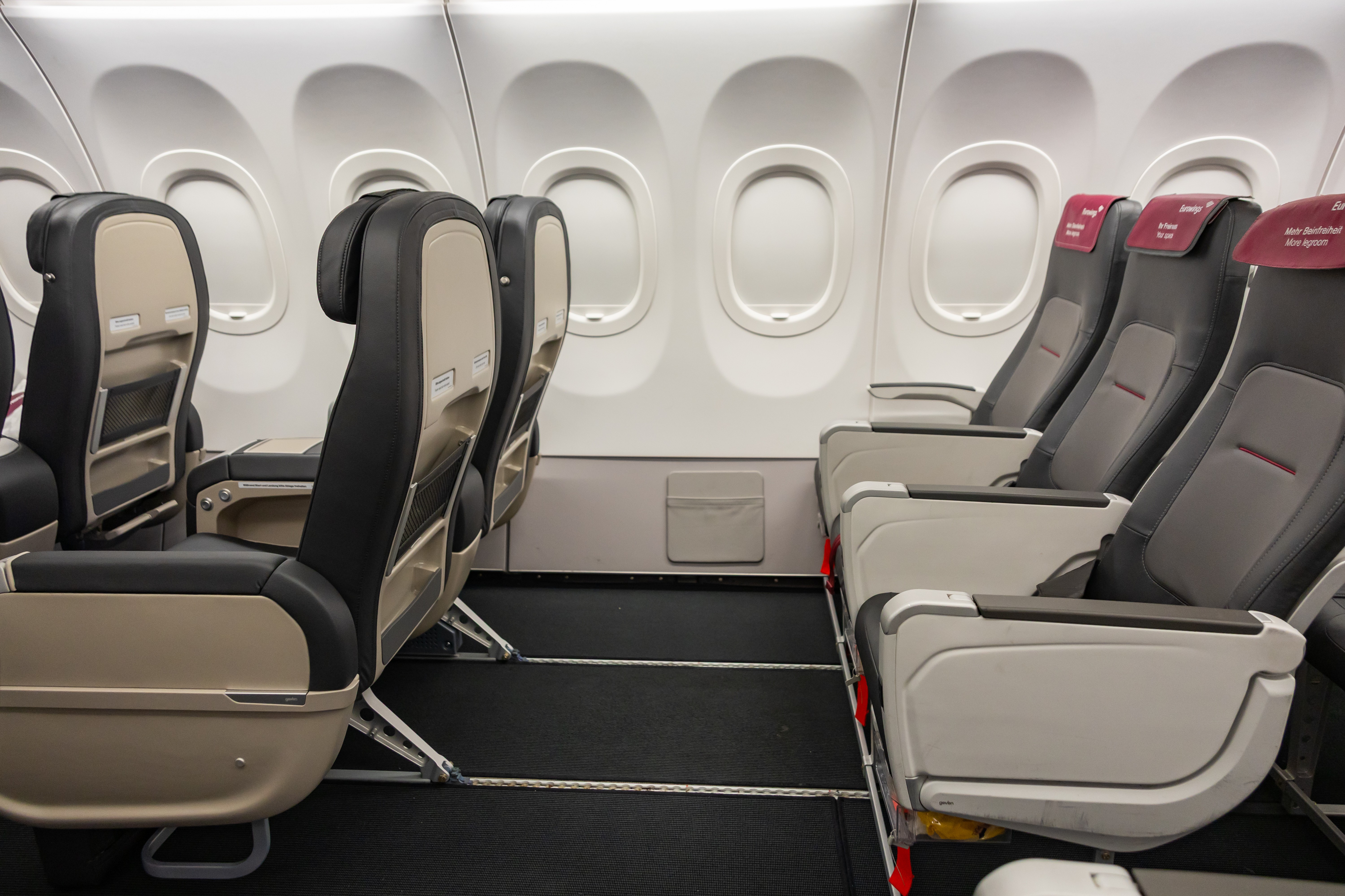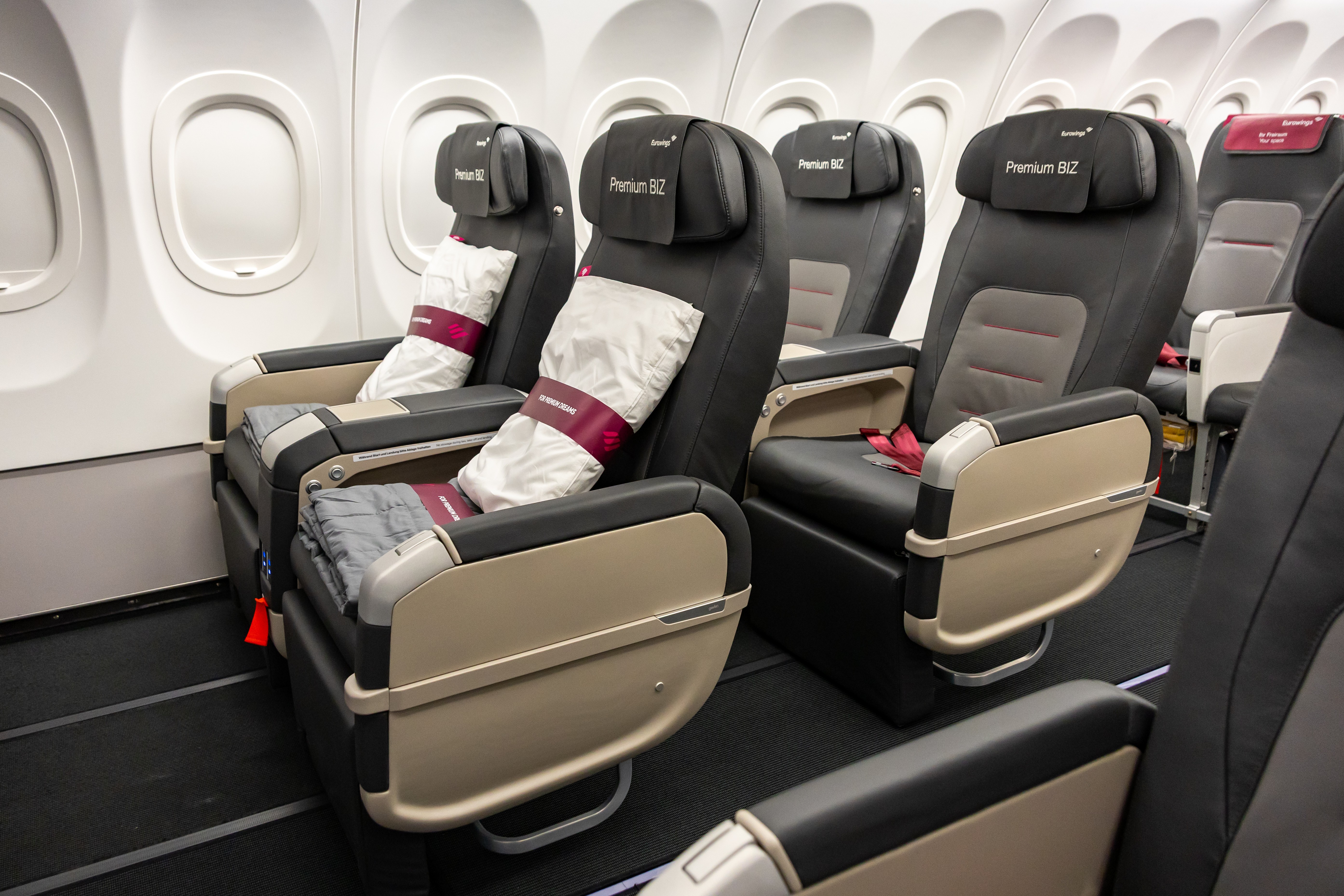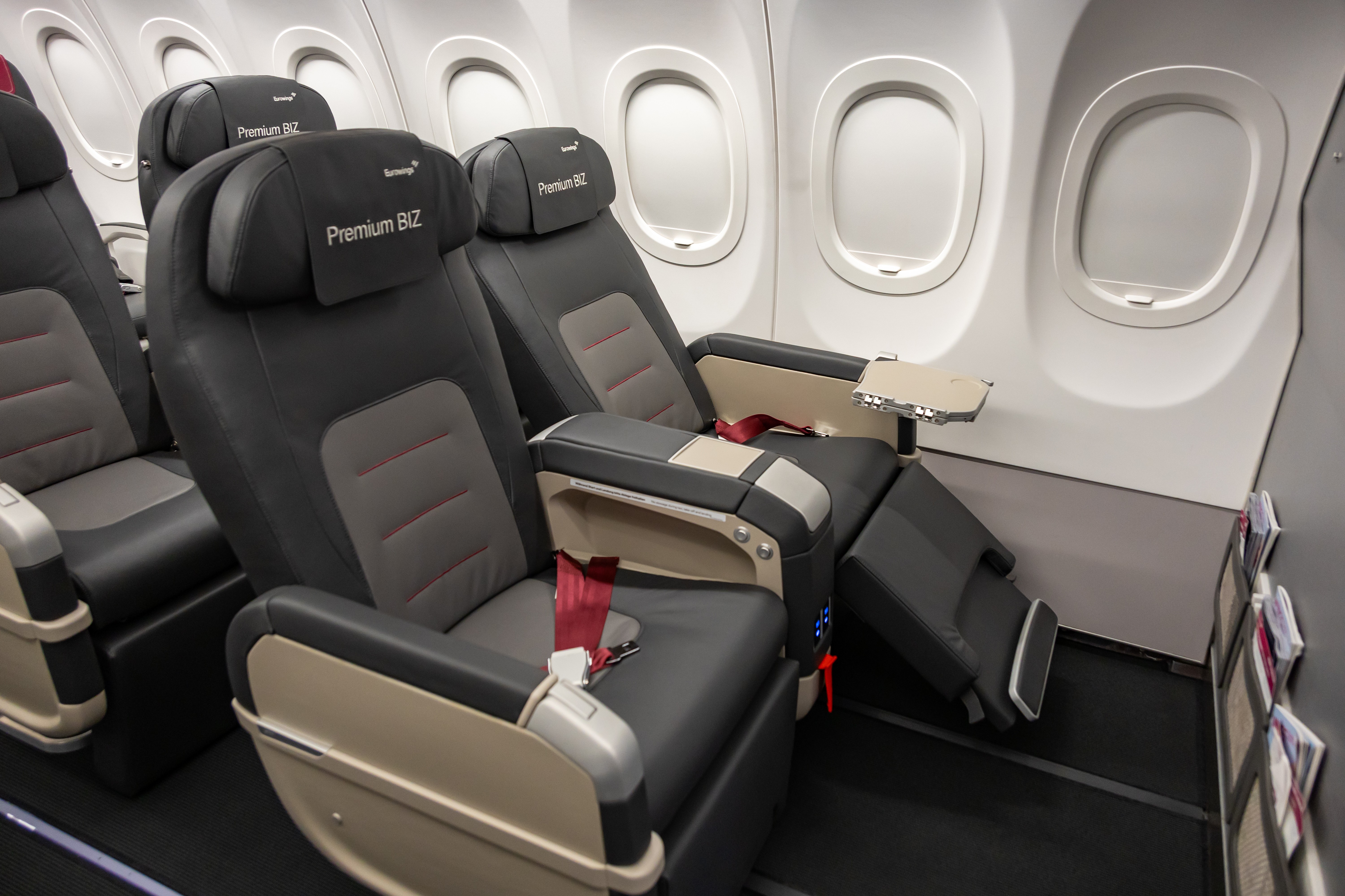 In den vorderen beiden Reihen des Flugzeugs befinden sich dann erstmals bei Eurowings größere Sitze in einer 2-2-Konfiguration. Sie zeichnen sich durch mehr Platz, sowie weiter verstellbare Rückenlehnen und Beinstützen aus. Die Umstellung von einer Position in die andere wird ähnlich wie bisher über zwei Druckknöpfe gesteuert.