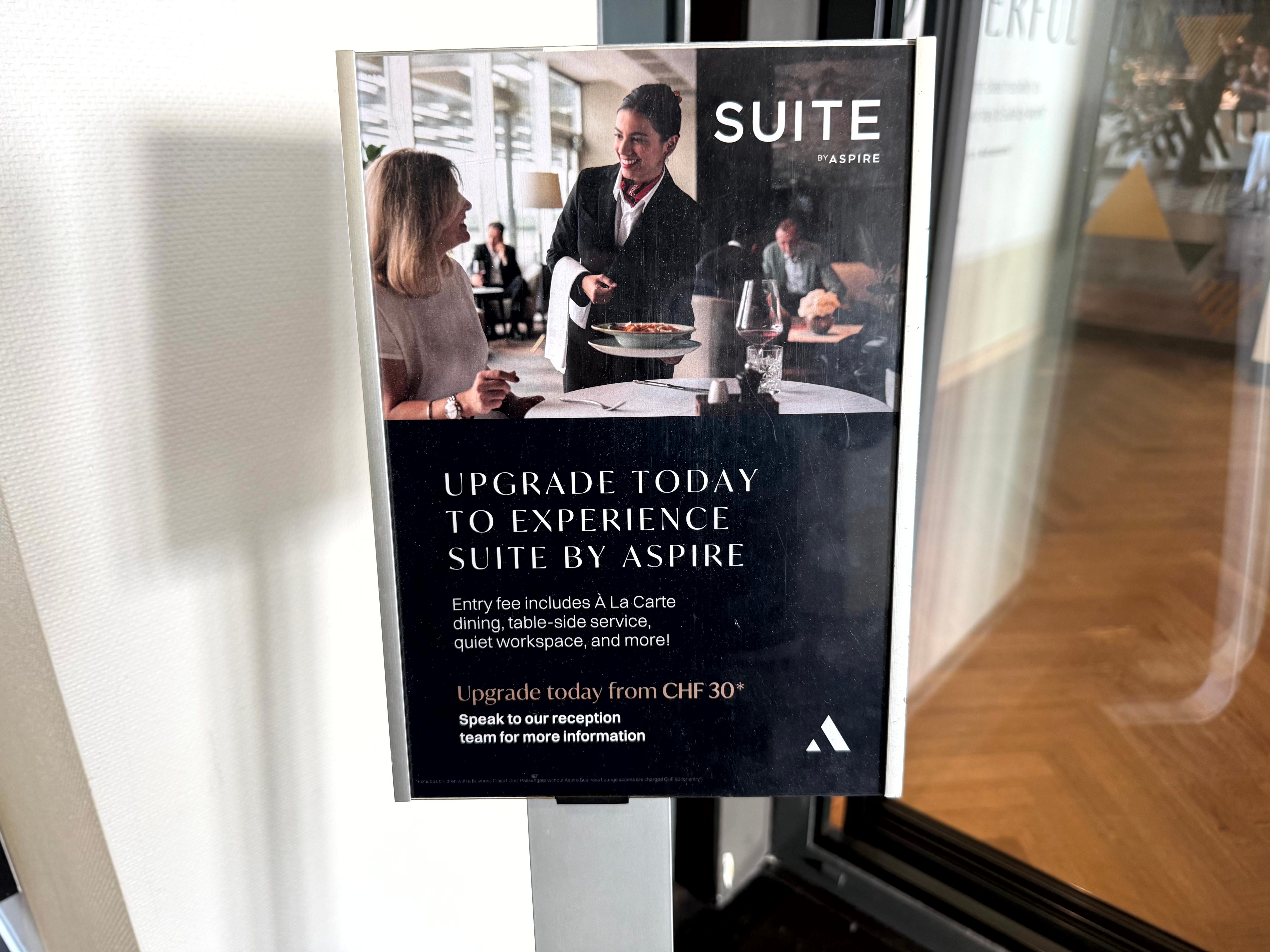 Am Eingang der Business Lounge wirbt eine gut platzierte Tafel für das Upgrade in die Suite by Aspire. aeroTELEGRAPH