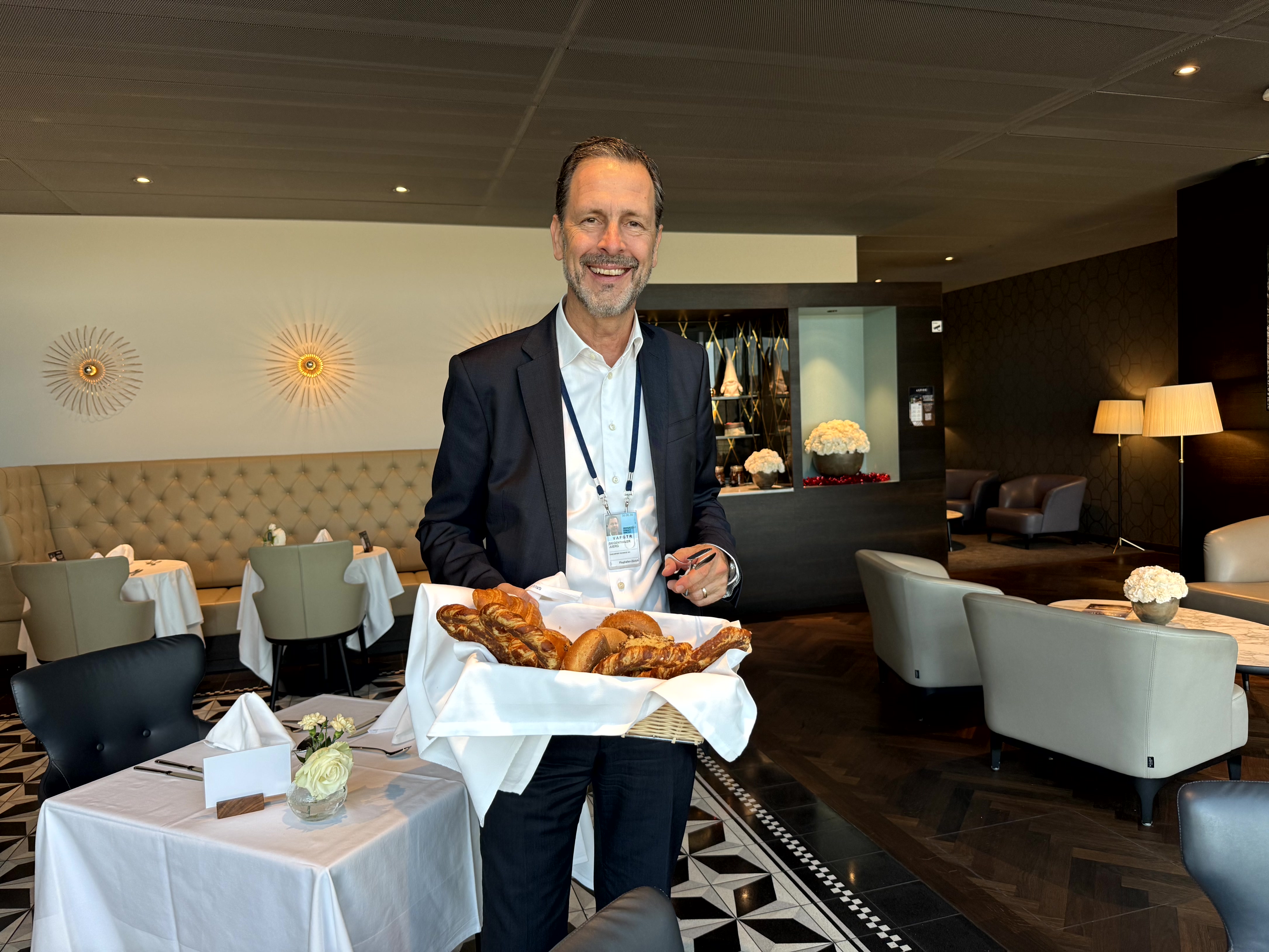 Jürg Siegenthaler, Regional Head of Aspire Executive Lounges, übernimmt spontan den Service und präsentiert stolz den frisch gefüllten Brotkorb.
