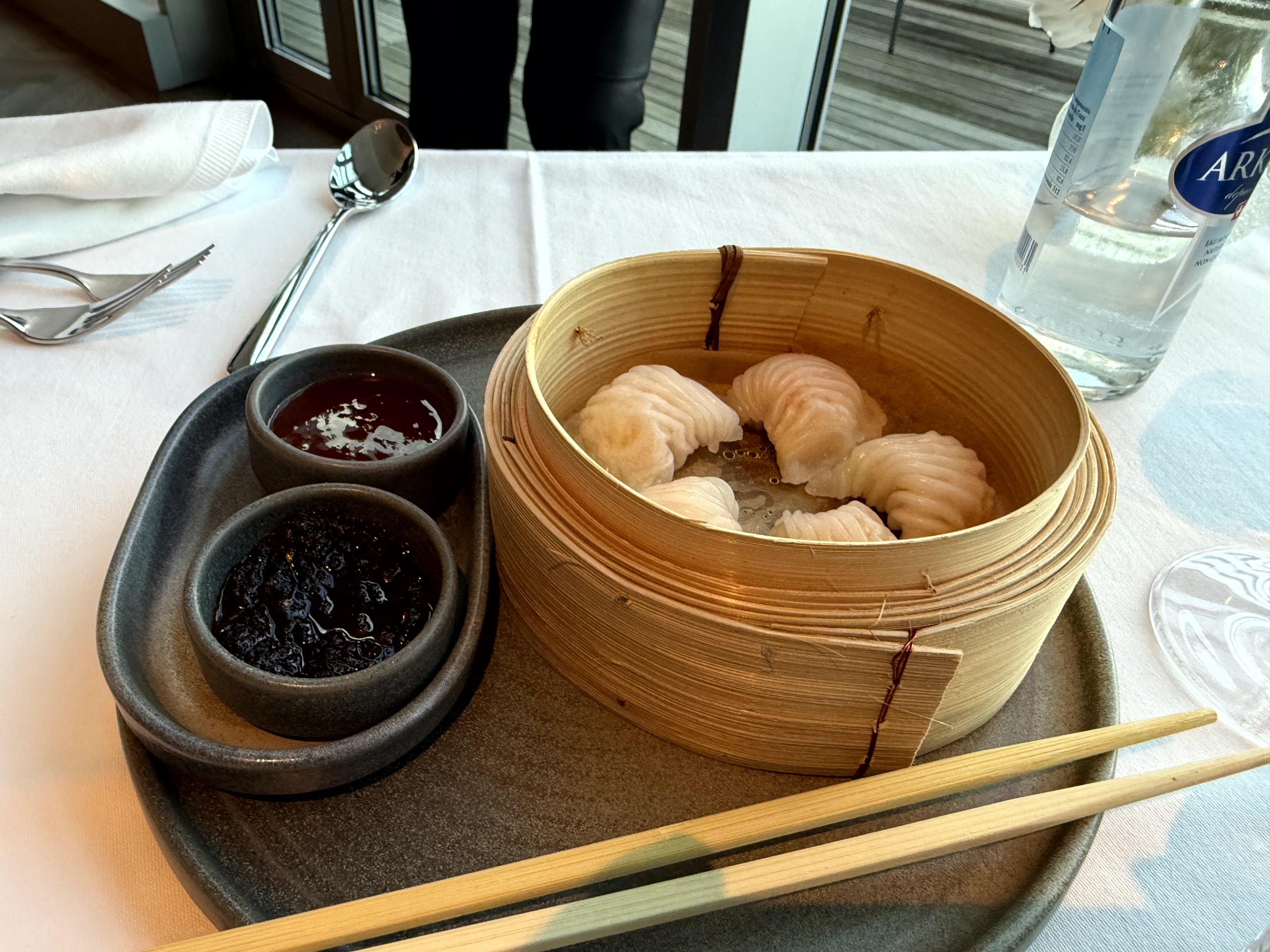 First-Class-Flair: Weisse Tischtücher prägen den Restaurantbereich der Aspire Suite Lounge.