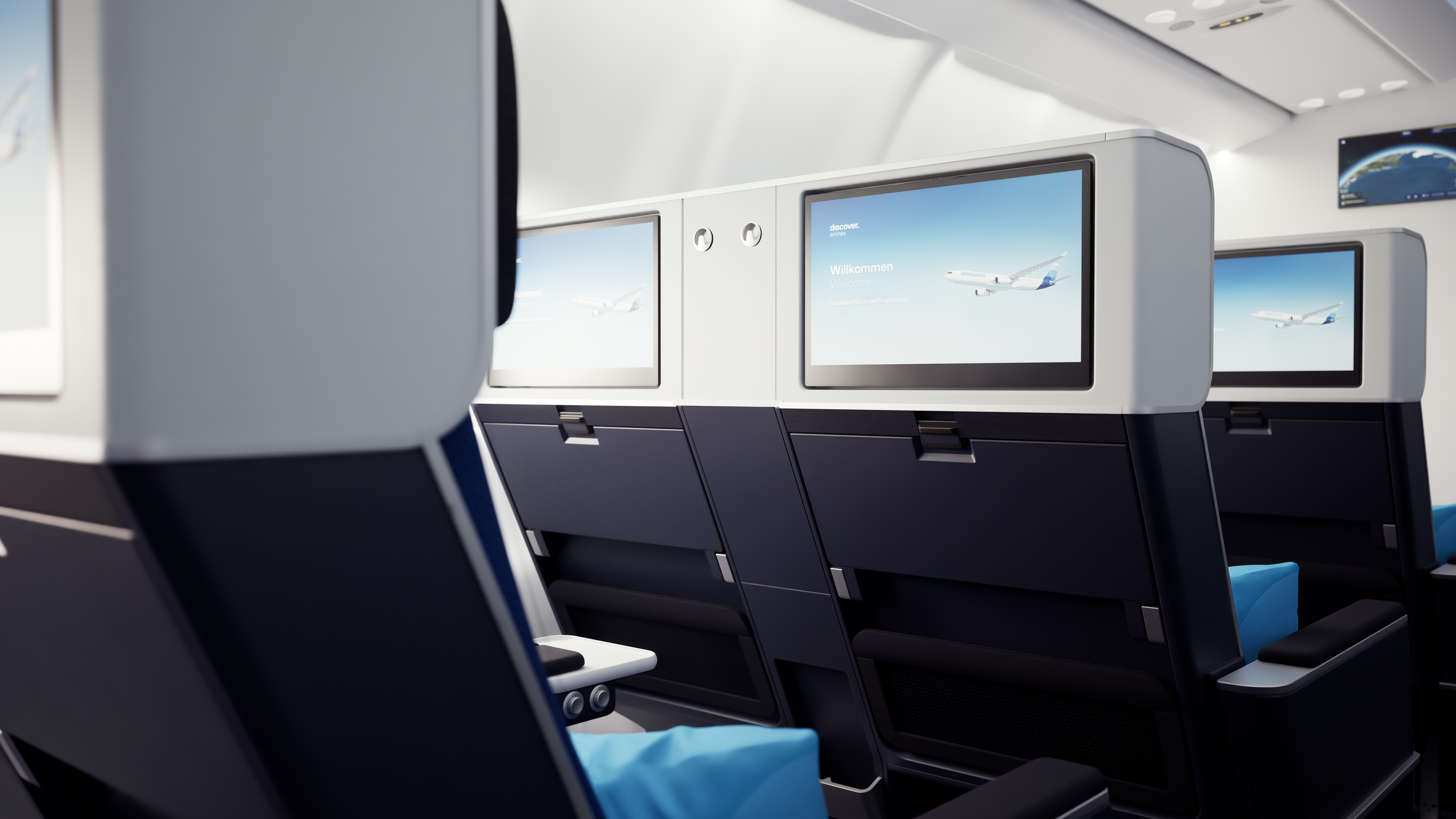 Die Touch-Bildschirme haben in der Economy Class eine Diagonale von 13,3 Zoll, in der Premium Economy von 15,6 Zoll, in der Business Class von 17,3 Zoll und in der Business Class Suite von 32 Zoll. In allen Klassen lassen sich Bluetooth-Kopfhörer daran ankoppeln. Es wird auch möglich sein, die Inhalte eines Smartphones oder Tablets auf den Bildschirm zu spiegeln. Und man kann einstellen, dass ein Film auf mehreren Bildschirmen gleichzeitig startet. Wie auch andere Lufthansa-Group-Airlines führt Discover Starlink-Internet ein.