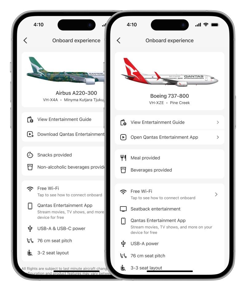 Qantas ändert das nun. Die Fluggesellschaft zeigt in ihrer eigenen App künftig ein Bild des Flugzeugs und somit auch die Lackierung. Dazu sind Kennzeichen und Name der Maschine zu sehen sowie Informationen zu Konfiguration, Sitzabstand, Bordunterhaltung, Wifi und USB-Anschlüssen im Flugzeug. Auch die Verpflegung der eigenen Buchung wird angezeigt.