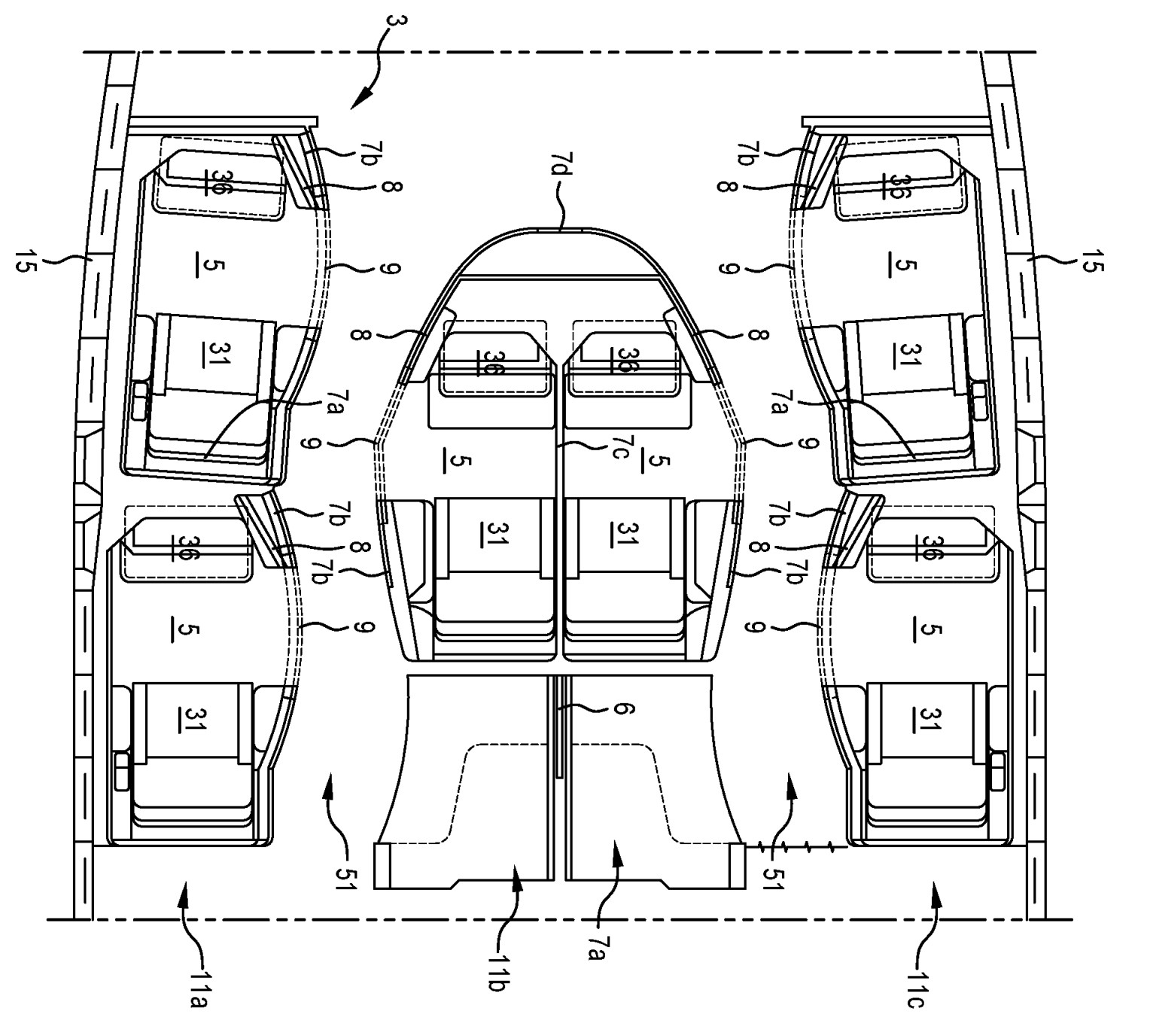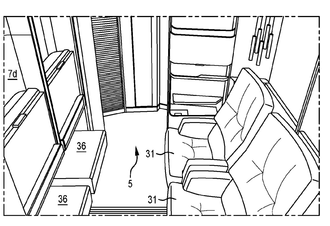 Ein Patent-Dokument aus dem Jahr 2022, das Anfang 2024 veröffentlicht wurde, zeigt, wie die Anordnung in der Boeing 777-9 aussehen dürfte. In der Mitte gibt es zwei Einzel-Suiten, die sich aber auch zu einer Doppelsuite verwandeln lassen. Sind es Einzel-Suiten, könnte die Höhe der Trennwand zwischen ihnen eine beliebige Höhe haben, heißt es in dem Patent-Dokument, «zum Beispiel in einem Bereich von 1,5 - 1,9 m, typischerweise 1,7 m». Ansonsten befinden sich jeweils zwei Plätze auf jeder Seite am Fenster.