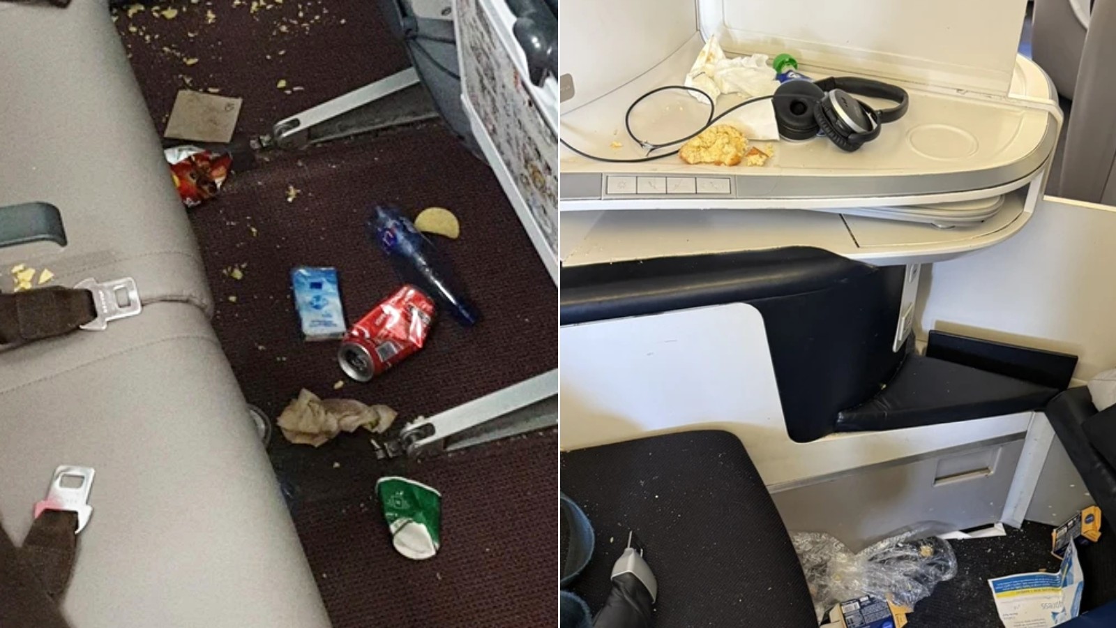 Doch damit ein einzelner Sitz oder eine Sitzreihe im Flugzeug wie eine kleine Müllhalde aussieht, sind gar keine Turbulenzen nötig. Das bekommt mancher Fluggast auch bei einem ruhigen Flugverlauf hin. Und wie der Platz nach der Ankunft aussieht, stößt der Crew und den Reinigungskräften am Boden sauer auf, wenn die Reisenden den Flieger verlassen haben.