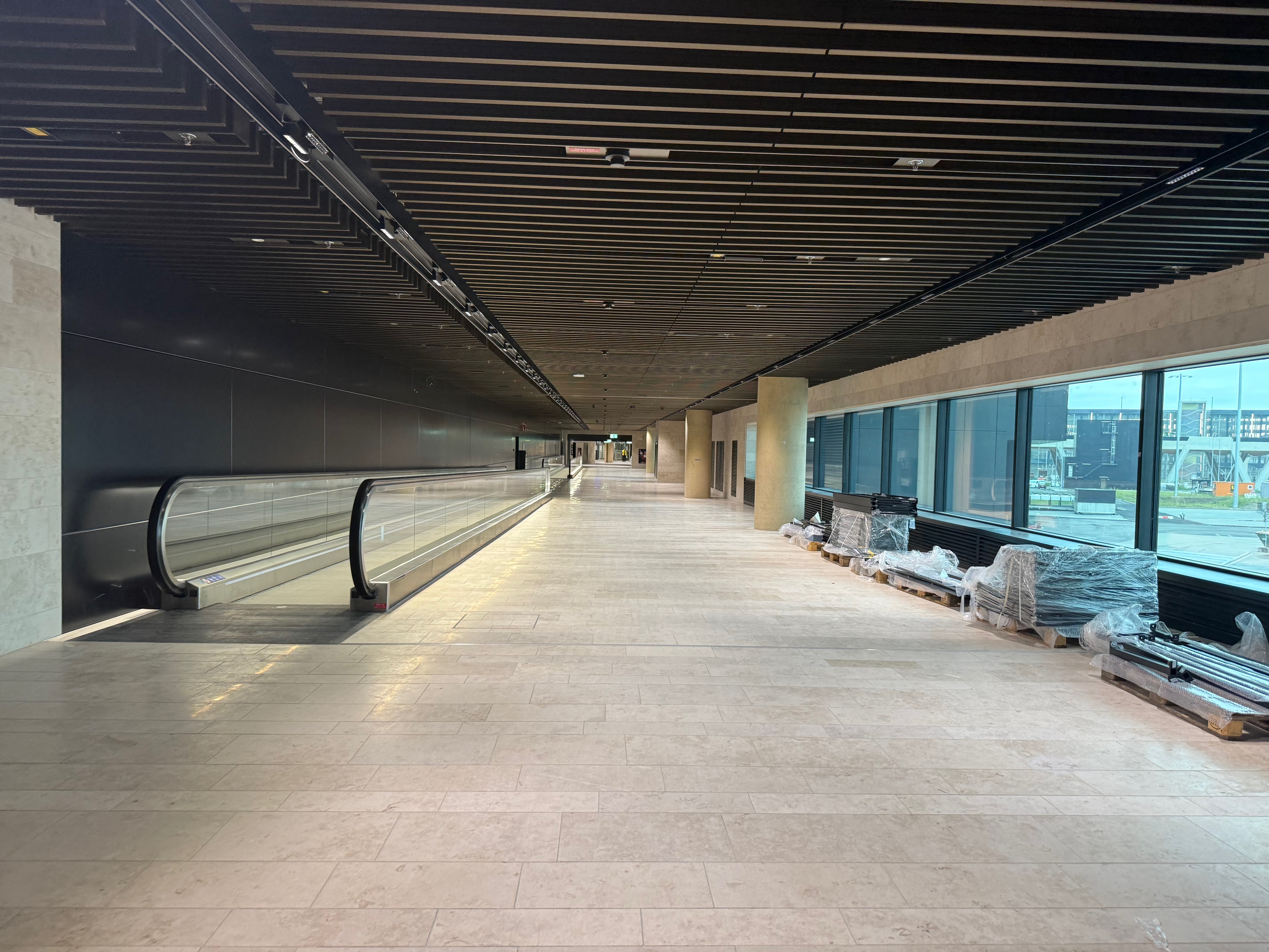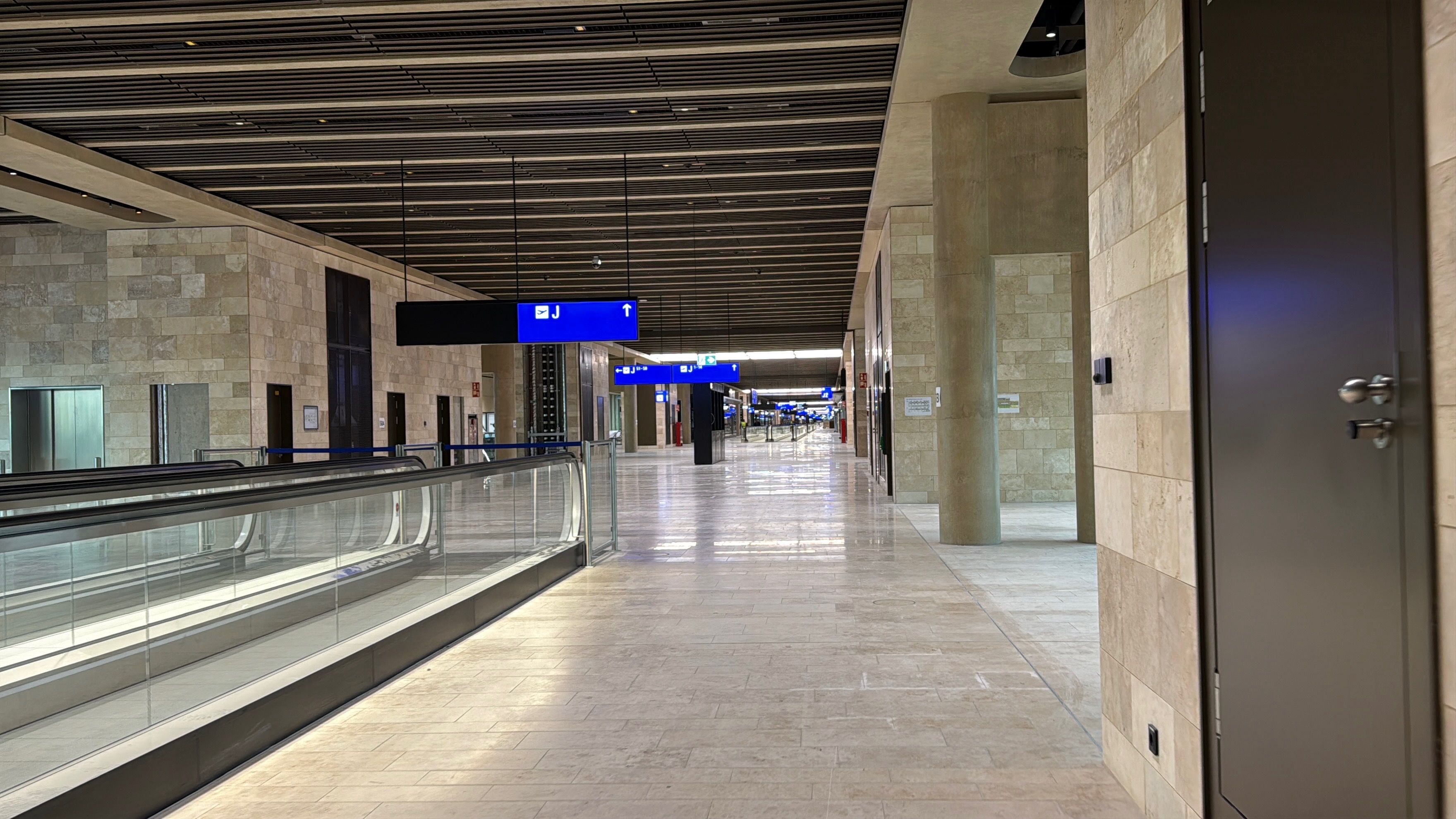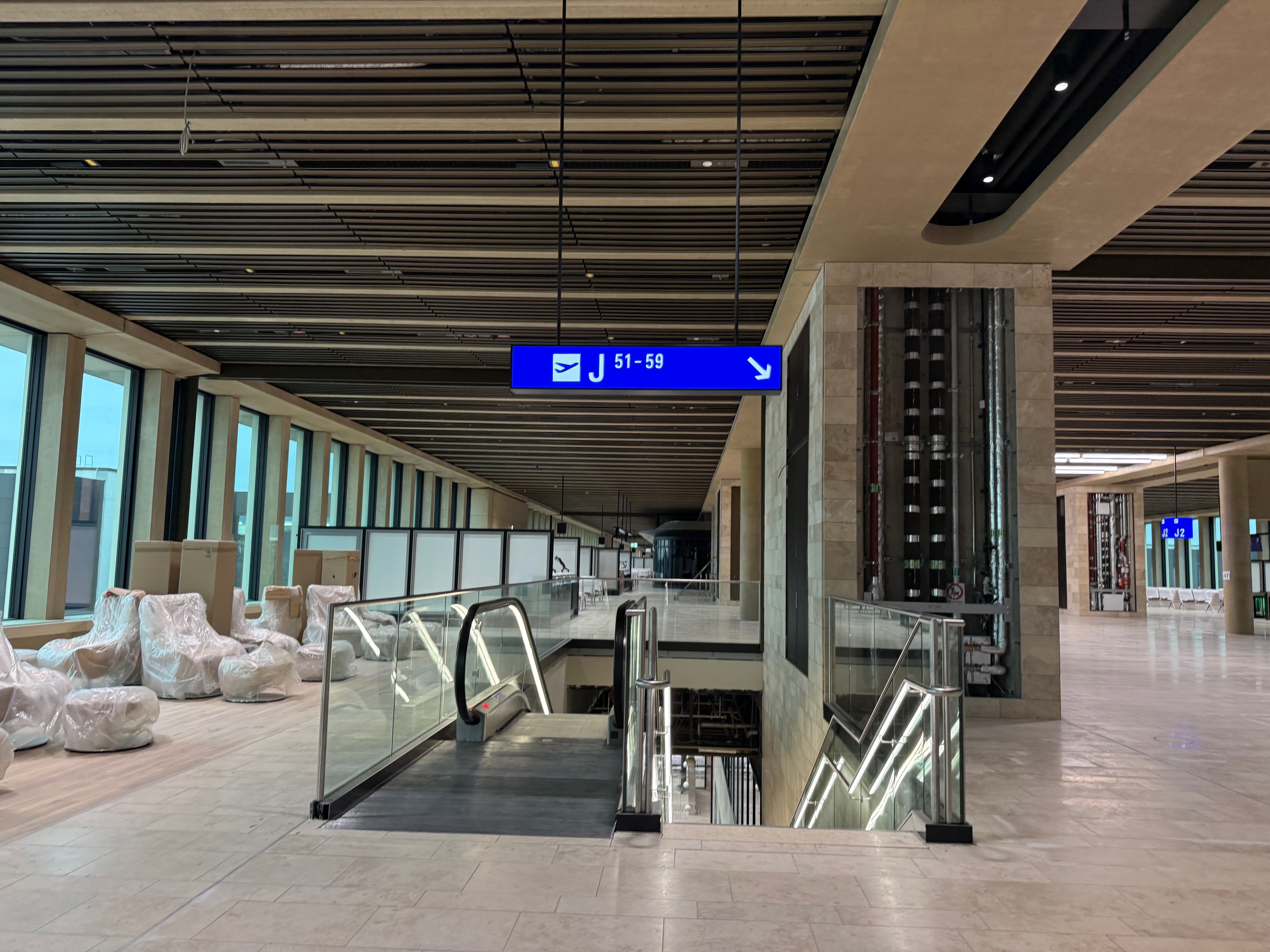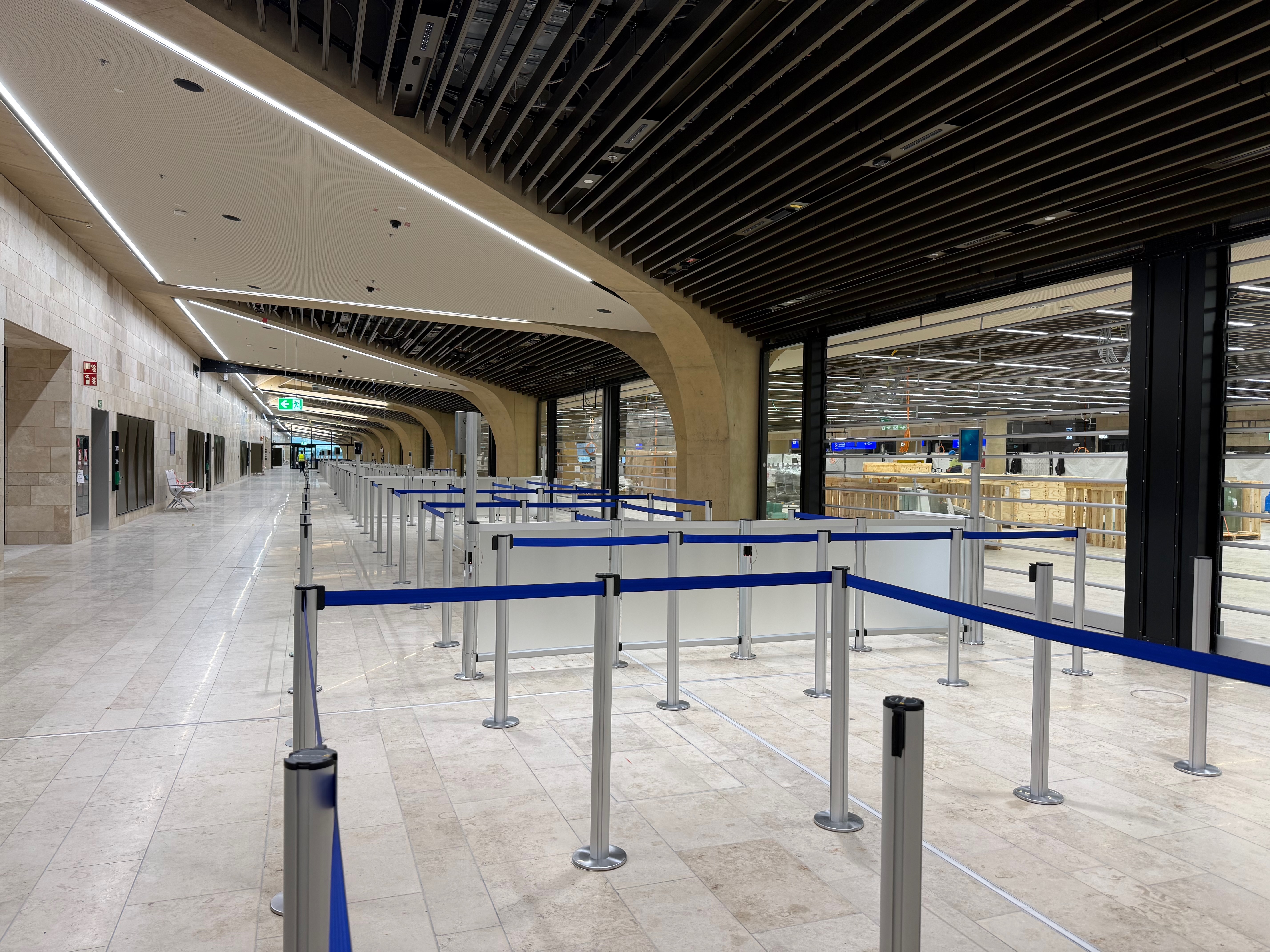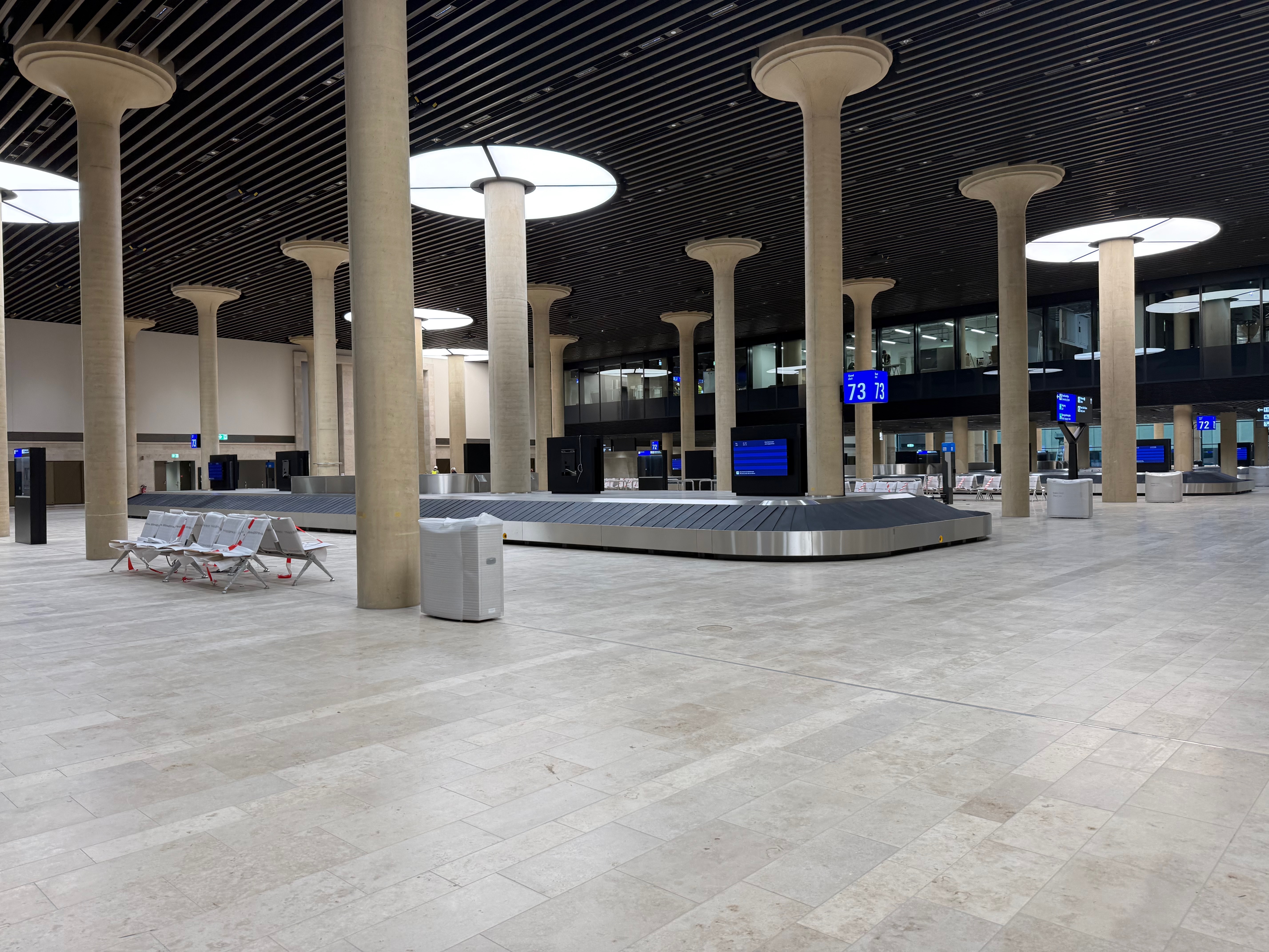 Beim Betreten der Eingangshalle fällt sofort die Dimension des Neubaus auf. Das Terminal wirkt groß, modern und zugleich einladend. Im Zentrum liegt der sogenannte «Marktplatz» – das Herzstück, wo Fluggäste die Zeit vor dem Abflug oder zwischen Flügen verbringen. Die Gestaltung von T3 ist warm gehalten, mit bodentiefen Fenstern an nahezu allen Seiten. Selbst bei den Sicherheitskontrollen fällt Tageslicht ein und ermöglicht den Blick auf das Rollfeld. Alles ist ebenerdig angelegt, was den Weg durch das Terminal angenehm macht. Dennoch: Wer hier unterwegs ist, wird viel laufen – an Fläche wurde nicht gespart. Auch architektonisch setzt T3 Akzente, etwa mit den zahlreichen Säulen in der Gepäckhalle.