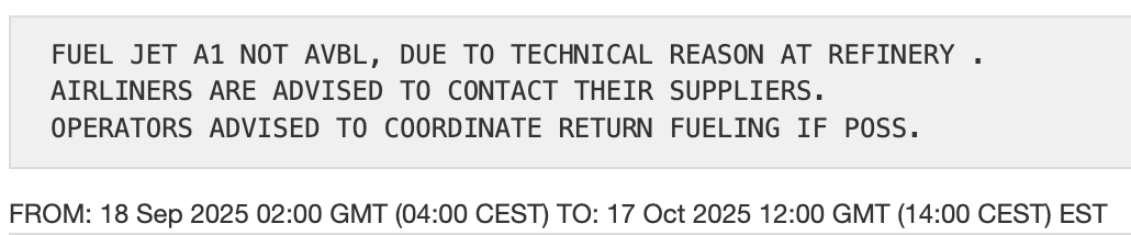 Dazu gibt es auch eine Notam, eine wichtige Mitteilung an Cockpitcrews. «Treibstoff Jet A1 nicht verfügbar», heißt es darin für den Flughafen Hamburg. Jet A1 ist Kerosin. Grund seien technische Probleme in einer Raffinerie, so die Notam, die sogar Gültigkeit vom 18. September bis zum 17. Oktober hat. Es handelt es sich um die Raffinerie Heide, wo am Montagmorgen turnusmäßige Wartungsarbeiten begonnen haben. Bis zum 4. Oktober läuft ein sogenannter TÜV-Stillstand, bei dem die Anlagen überprüft, gereinigt und instandgesetzt werden.
