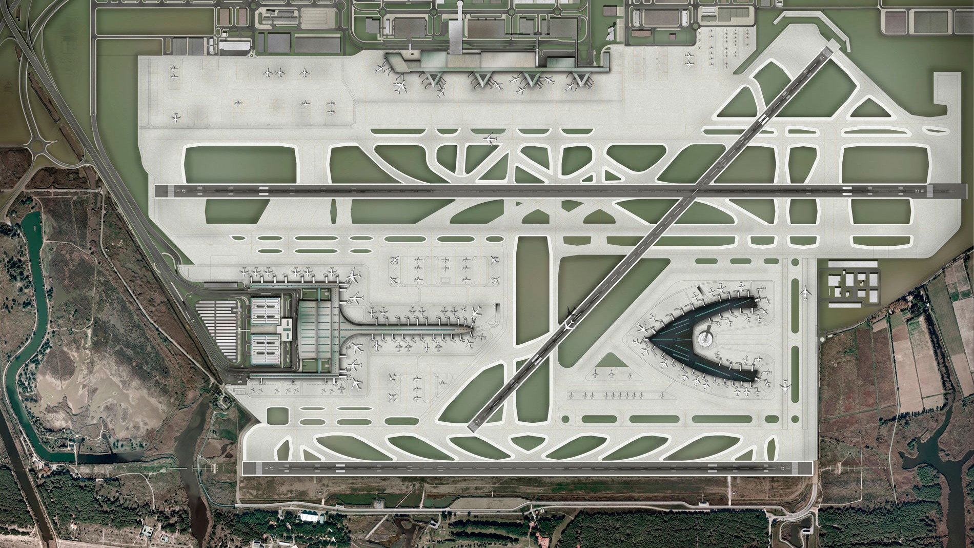 Entwurf des Satellitenterminals aus dem Jahre 2010: Das Architekturbüro hat auch schon die ersten beiden Terminals von El-Prat entworfen. Ricardo Bofill Taller de Arquitectura