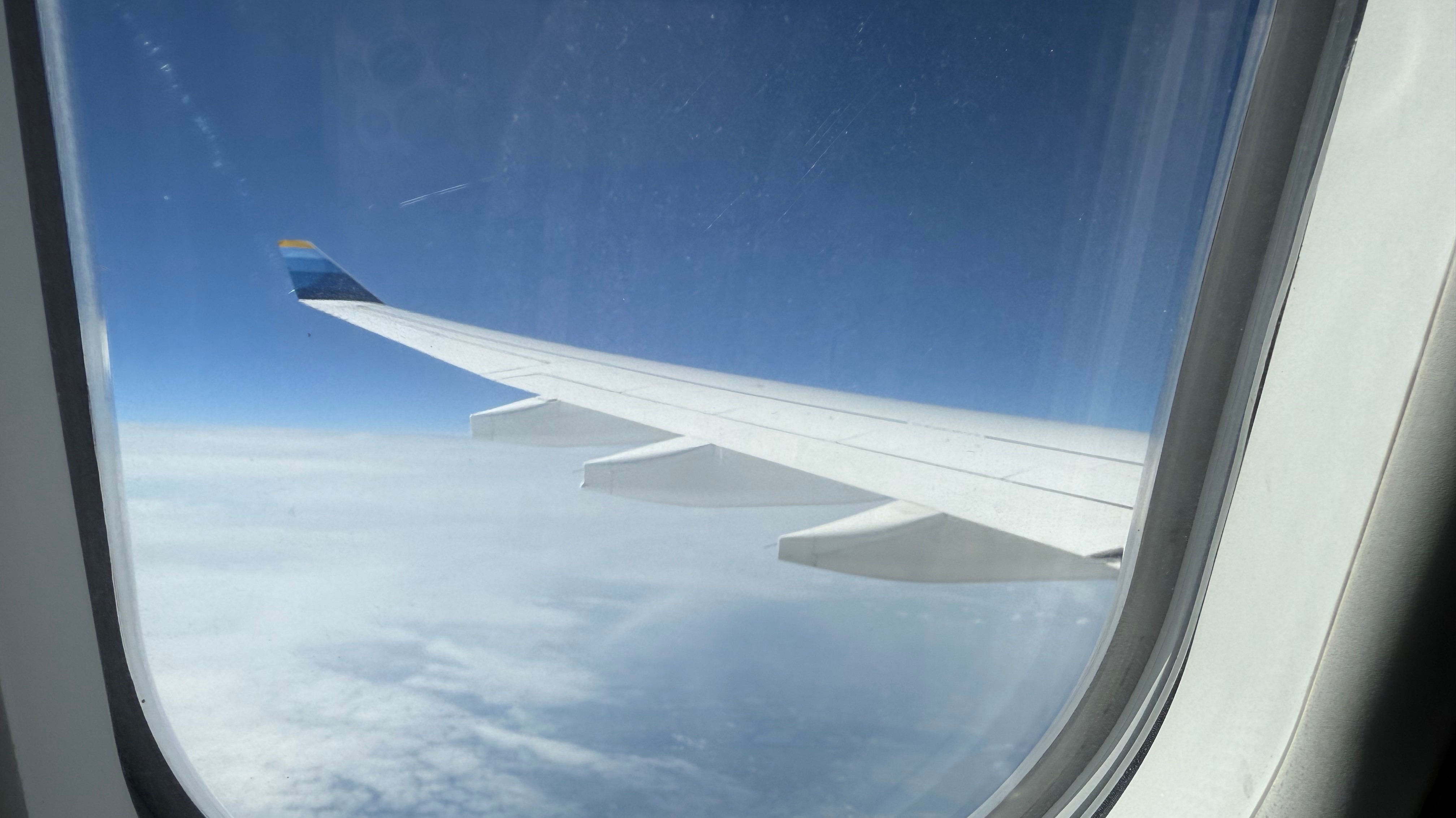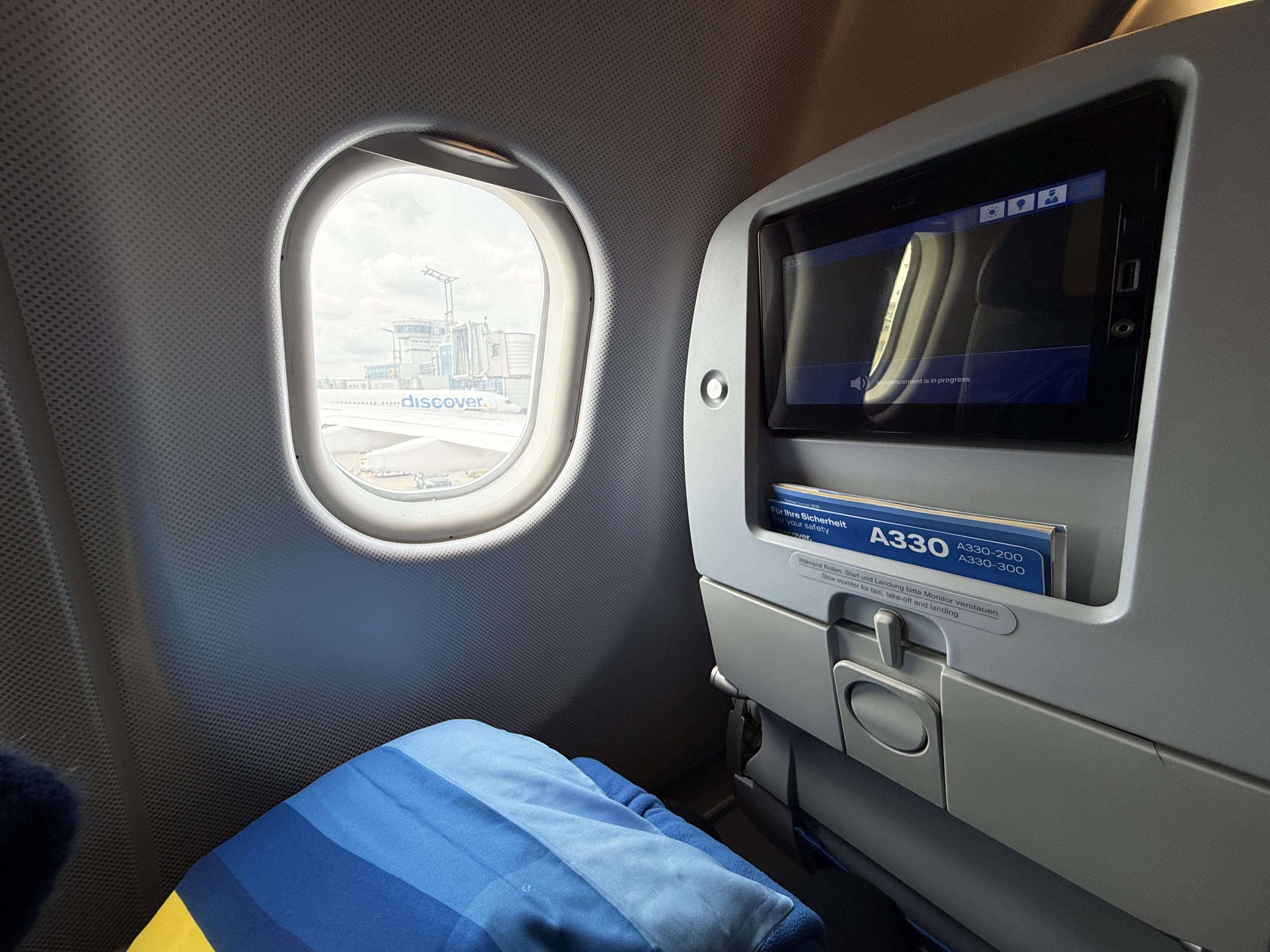 Da der Flug in die USA geht, müssen die Reisenden zuerst überprüfen lassen, ob sie alle Bedingungen für die Einreise erfüllen. Dafür stehen genug Schalter zur Verfügung. Die Kontrollierenden sind sehr freundlich und arbeiten effizient. Das Einsteigen danach hat Discover nach Gruppen organisiert. Und die Fluglinie zeigt das auch klar auf Bildschirmen an - und kontrolliert es auch. Das verhindert Chaos und Drängeln, wie es leider vielerorts vorkommt. Ich bin in Gruppe vier eingeteilt. Das bedeutet natürlich eine gewisse Wartezeit. Dennoch ist sie überschaubar. Beim Eintreten in den Airbus A330 werde ich freundlich begrüßt und mir wird der Weg zu meinem Platz gezeigt.