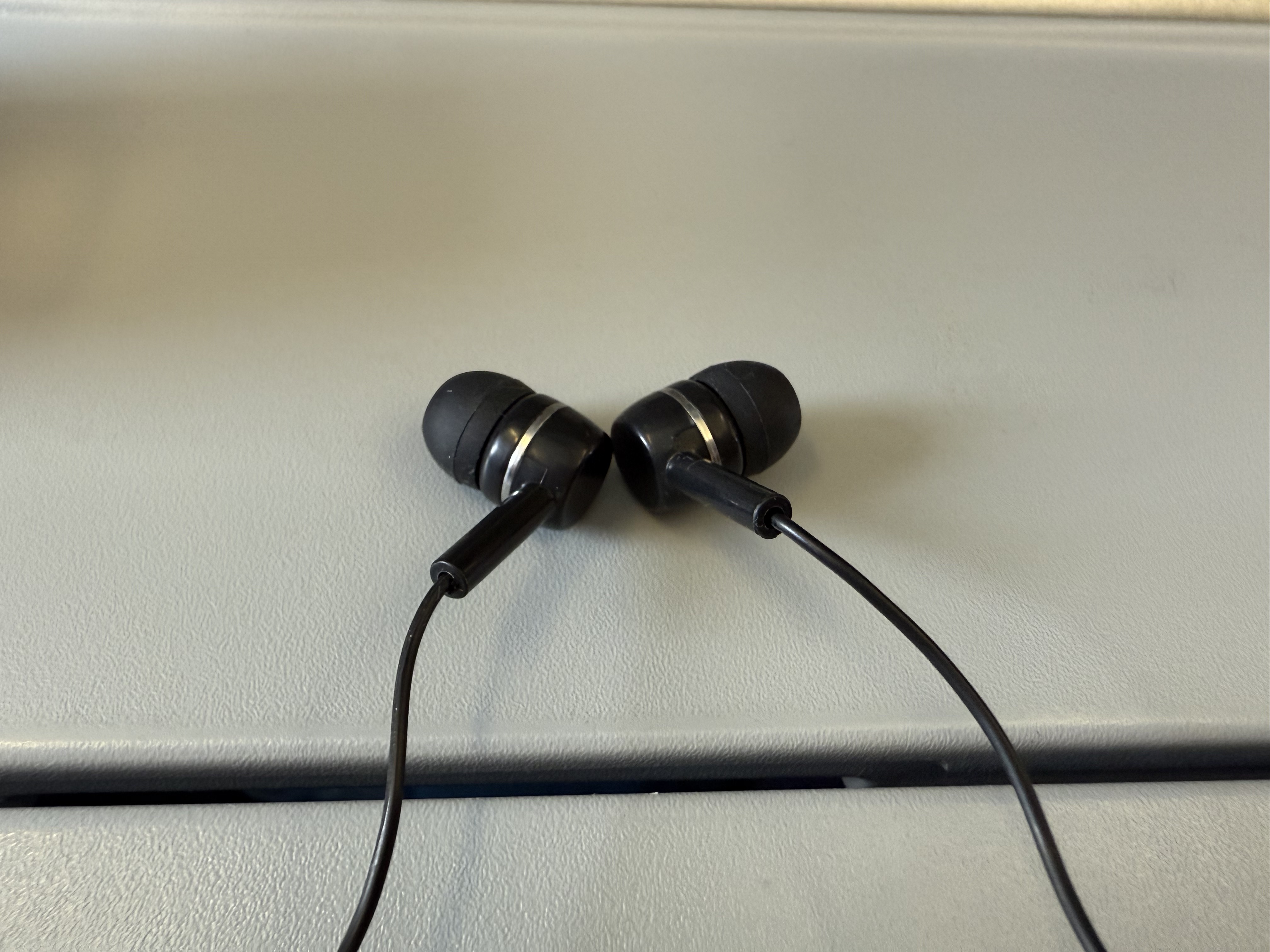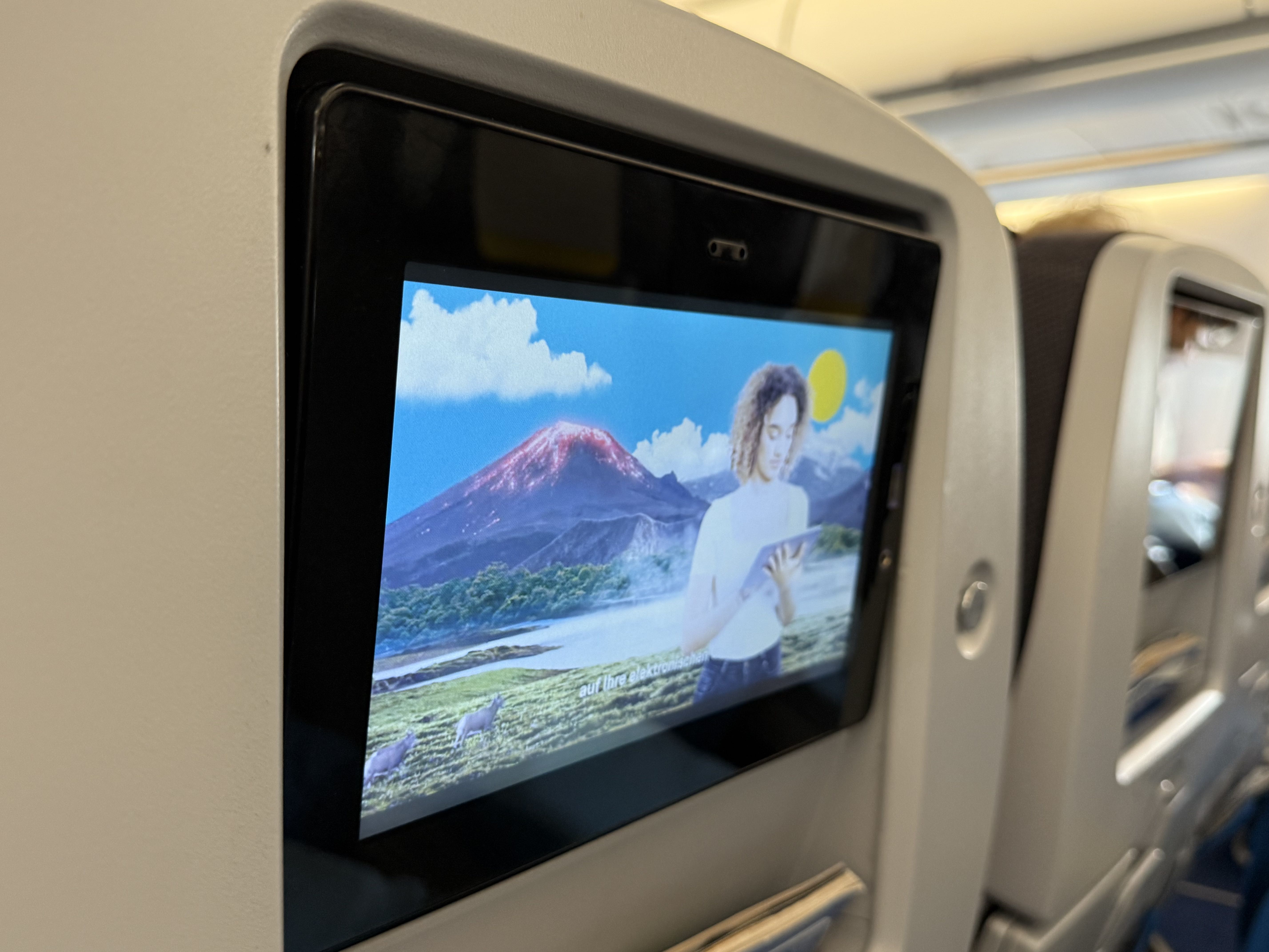 In der Rückenlehne des Vordersitz befindet sich ein berührungssensitiver Bildschirm. Es gibt dazu Knopf-Kopfhörer – sie sitzen bequem und klingen überraschend gut.