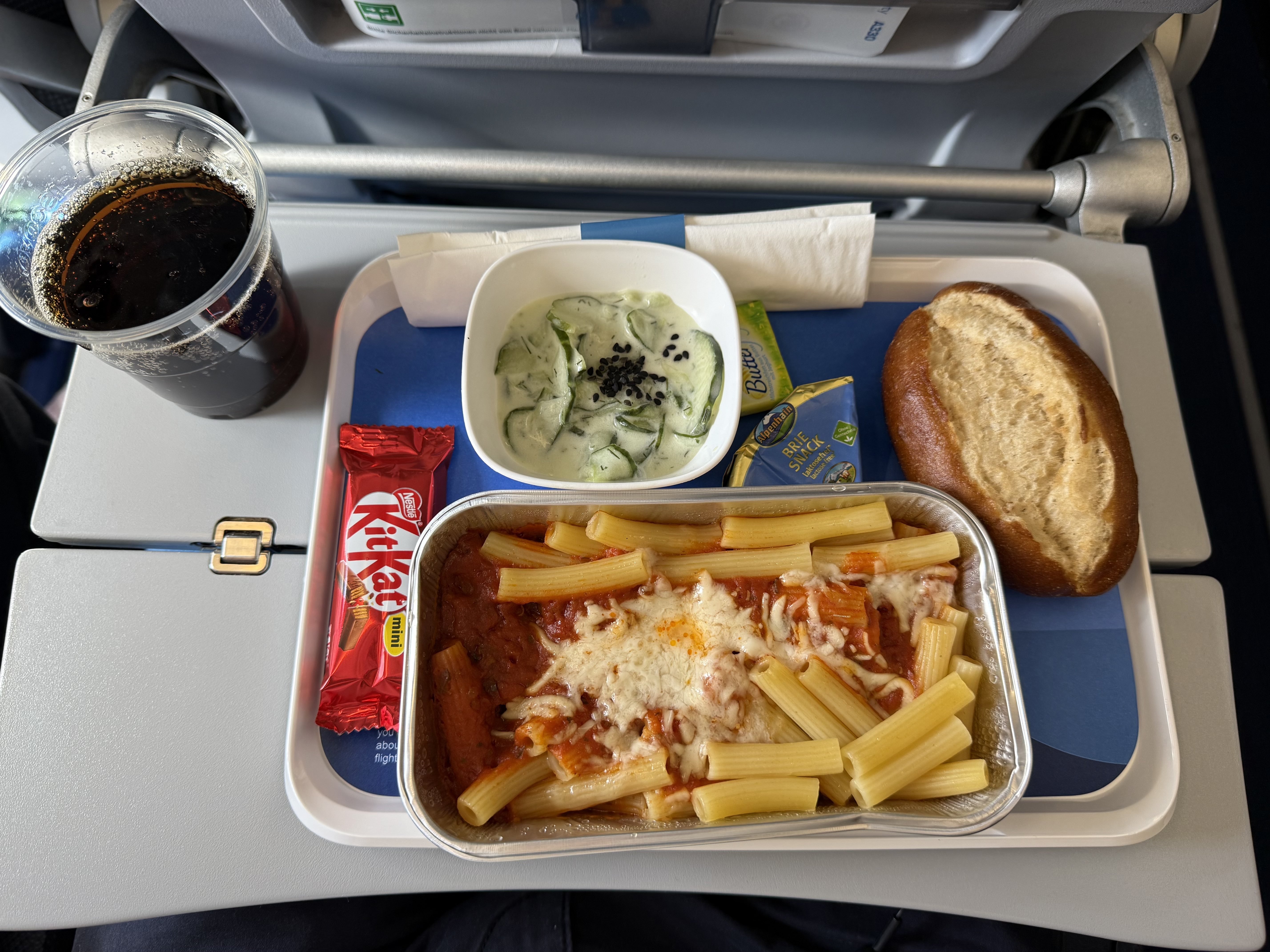 Mahlzeiten: ★★★★★. Das leibliche Wohl ist bei einem Ferienflieger wichtig. Und es muss eher traditionell sein. Hier trifft Discover voll. Auf der Reiseflughöhe wird bereits das Essen serviert. Das ist auch gut, denn es ist inzwischen nach 13 Uhr und ich bin langsam hungrig. Es gibt zur Vorspeise einen Gurkensalat mit einem Brötchen. Die Hauptspeise sind Penne Rigate mit Tomatensauce und geriebenem Parmesan. So einfach das ist - es mundet hervorragend. Zur Nachspeise liegt ein Kitkat-Riegel auf dem Tablett und ein kleiner Brie, wer eher Käse mag.