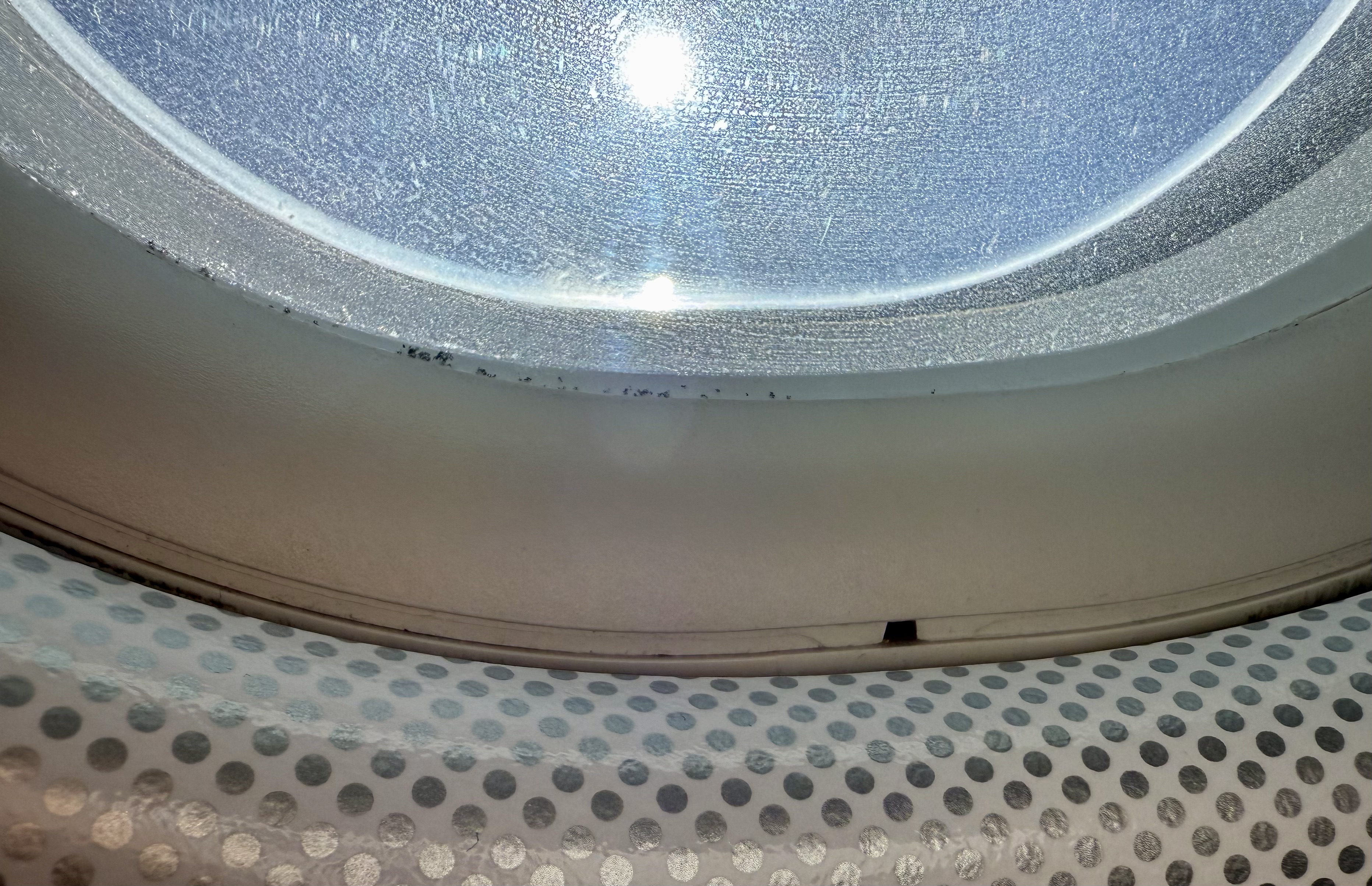 Kabinenausstattung: ★★★★☆. Ich reise mit dem Airbus A330-300 mit dem Kennzeichen D-AIKA nach Alaska (Ex-Lufthansa, Ex-Brussels Airlines, Ex-Eurowings). Sein Alter von fast 22 Jahren merkt man ihm nur stellenweise an. An einigen Stellen, so etwa im Waschraum, bei den Fenstern oder an einigen Verkleidungen und vergilbten Stellen, zeigen sich Spuren der Zeit. Und mein Tisch hat einen kleinen Riss. Abgesehen davon präsentiert sich die Kabine in einem gepflegten Zustand.