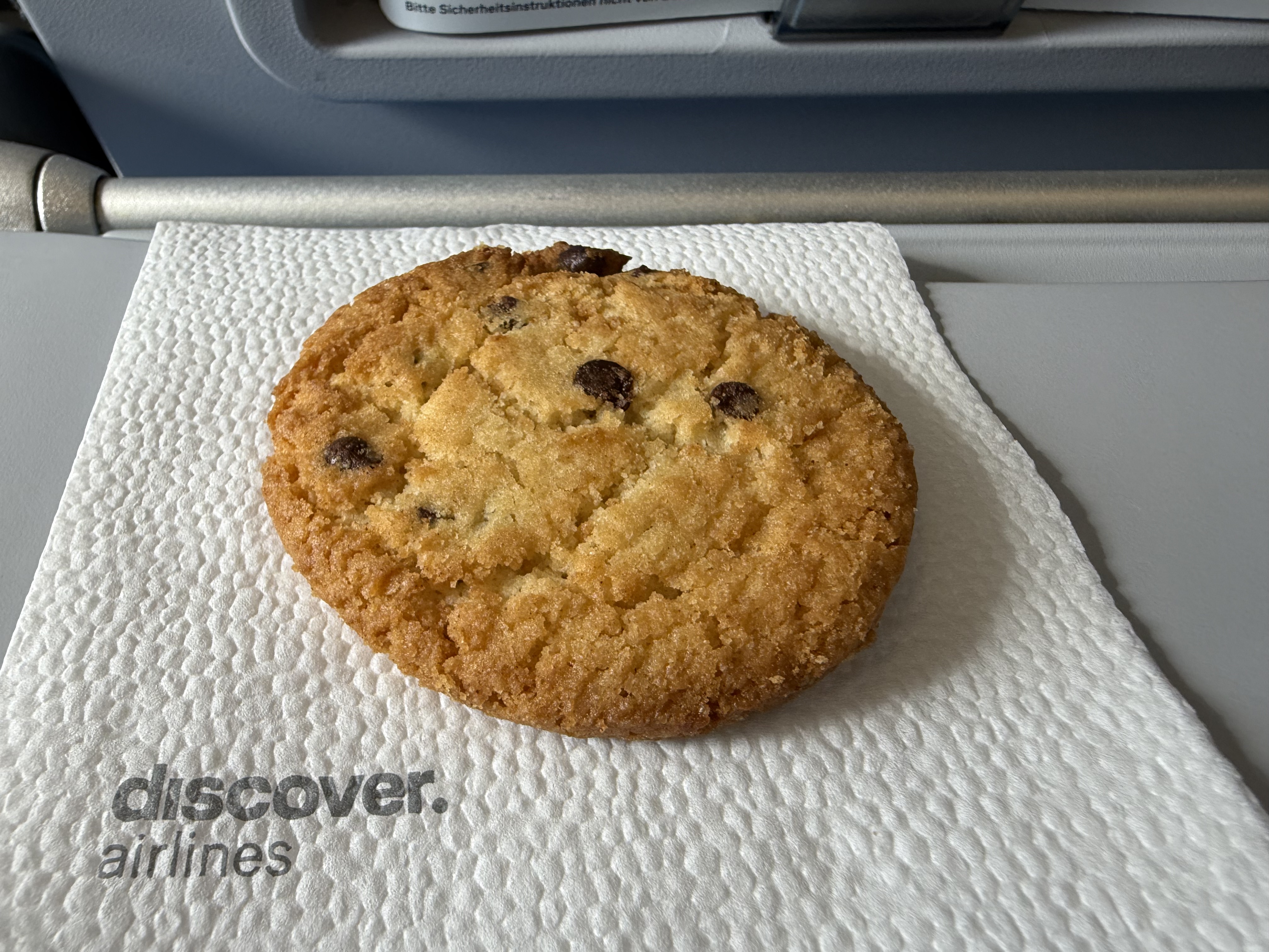 Nach der Hauptmahlzeit wird von der Crew noch ein heißer Schokokeks, verteilt, der reichlich süß, aber sehr lecker ist. Dazu gibt es Tee und Kaffee. Und vor der Landung verteilt sie noch eine Box mit salzigem Strudel und Muffin. Dazu gibt es nochmals Getränke.