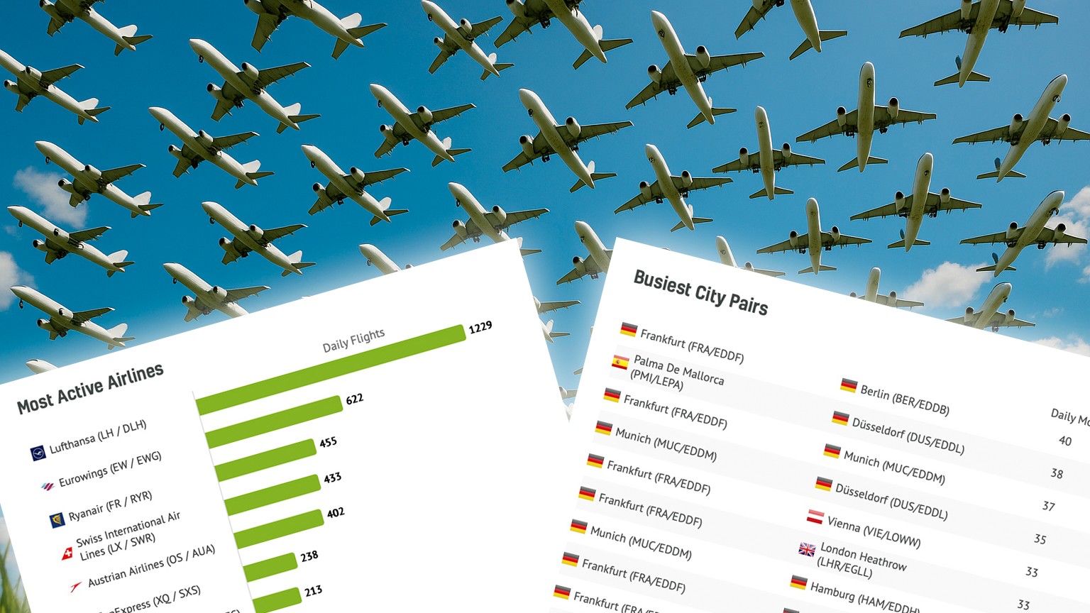 Die Rubrik Most Active Airlines zeigt, welche Gesellschaften an einem bestimmten Tag dominieren, während Busiest Airports die verkehrsreichsten Flughäfen wie Frankfurt, Wien, Zürich oder Luxemburg listet. Mit den Busiest City Pairs lassen sich außerdem die meistgeflogenen Strecken nachverfolgen. Unter Most Active Aircraft Types erkennen Nutzerinnen und Nutzer, ob Airbus A320, Boeing 737 oder andere Modelle den Himmel bestimmen.
