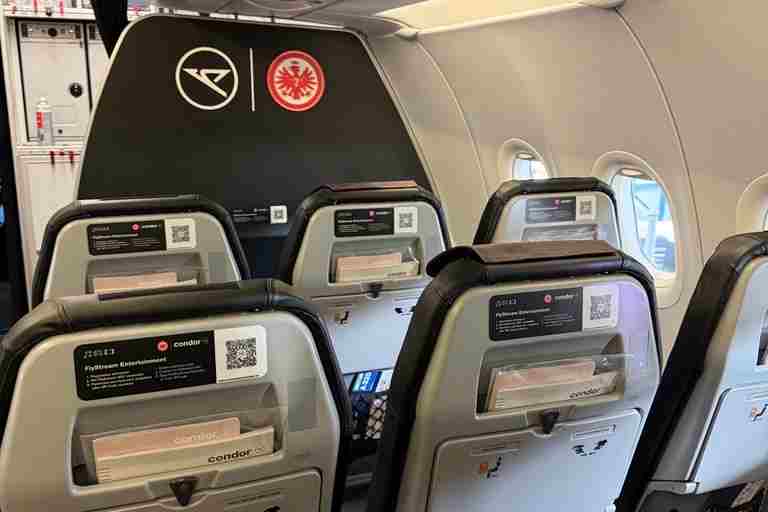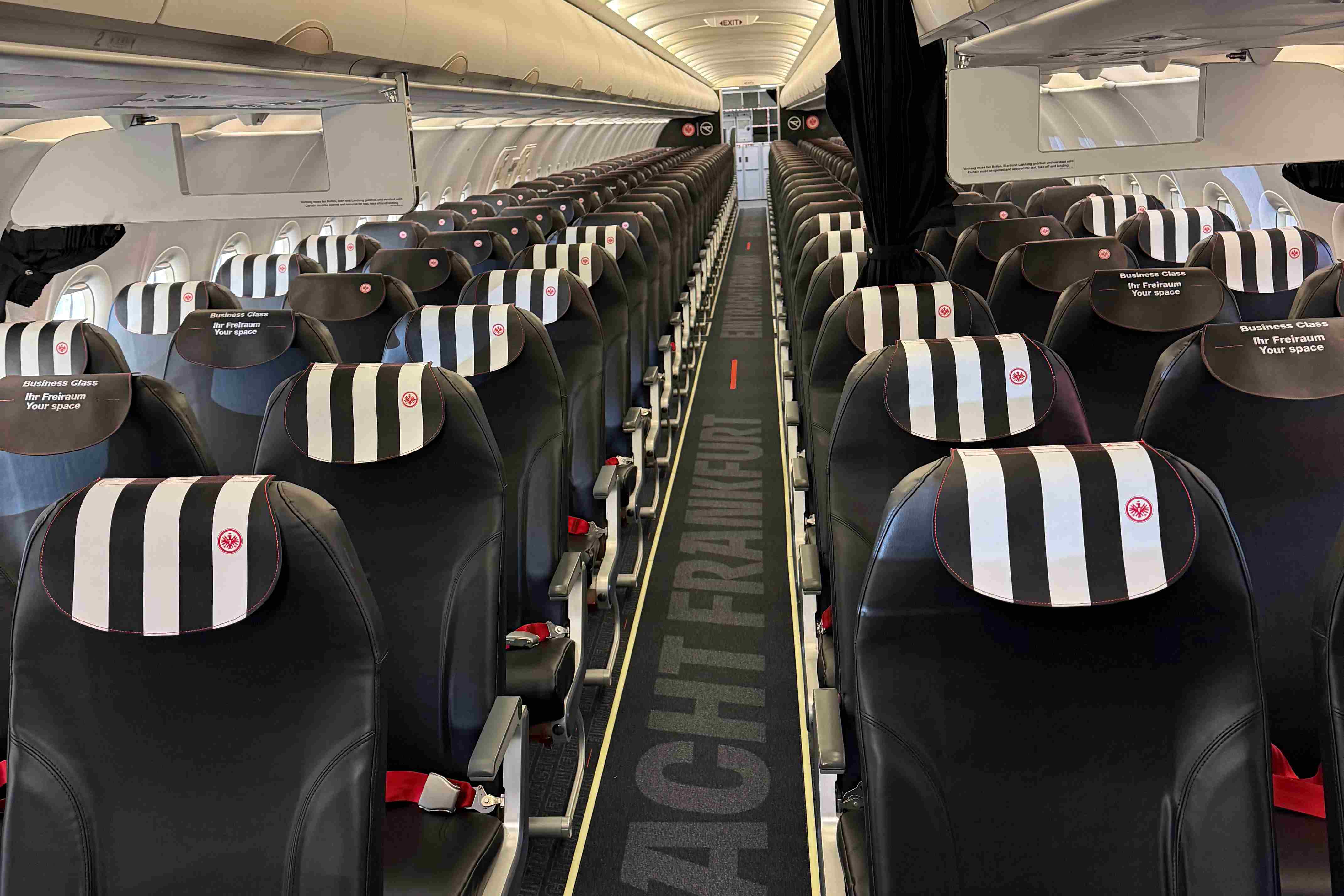 Der Ferienflieger hat jetzt auch einen schwarz-weiß geringelten Flieger. Der Airbus A320 ist dem Fußballverein Eintracht Frankfurt gewidmet. Das sieht man auch im Innern des Condor-Jets.