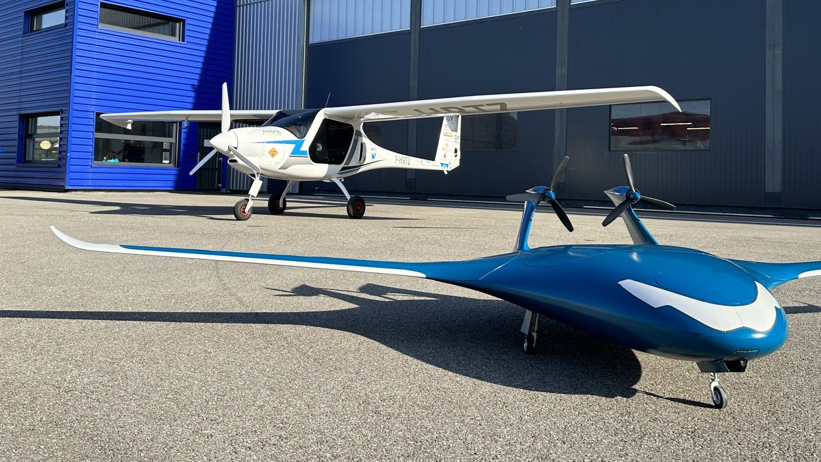 Im Hintergrund ist die Velis Electro von Pipistrel, das erste zertifizierte Elektroflugzeug, zu sehen. Im Vordergrund steht ein Modell, das ein wenig an einen Tarnkappenbomber oder an die Phantom 3500 von Otto Aviation erinnert und die Zukunft des regionalen Luftfahrt werden soll.