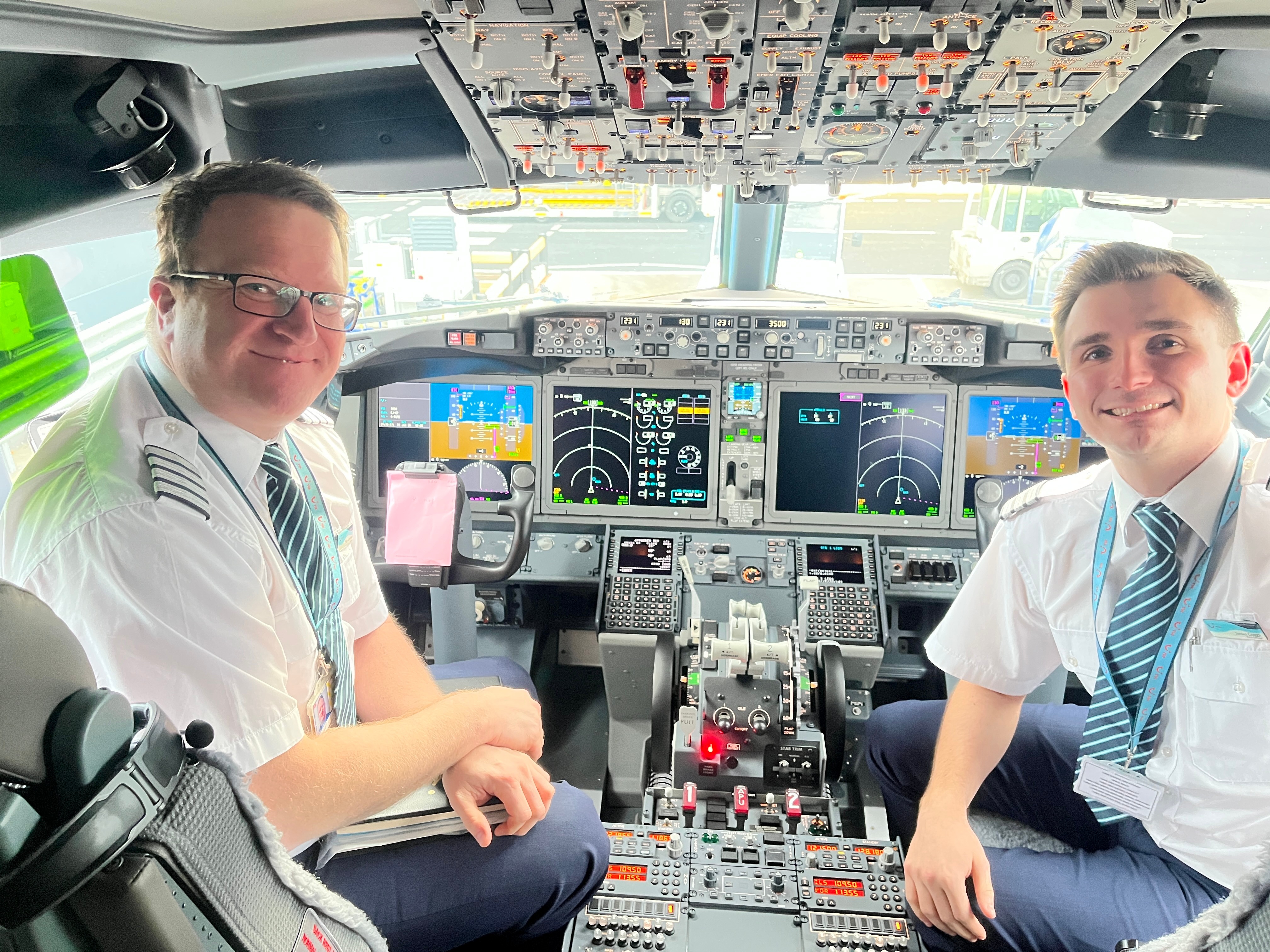 Kapitän Stijn Lambrecht und Kopilot James Craggs nach der Landung in Manchester. aeroTELEGRAPH