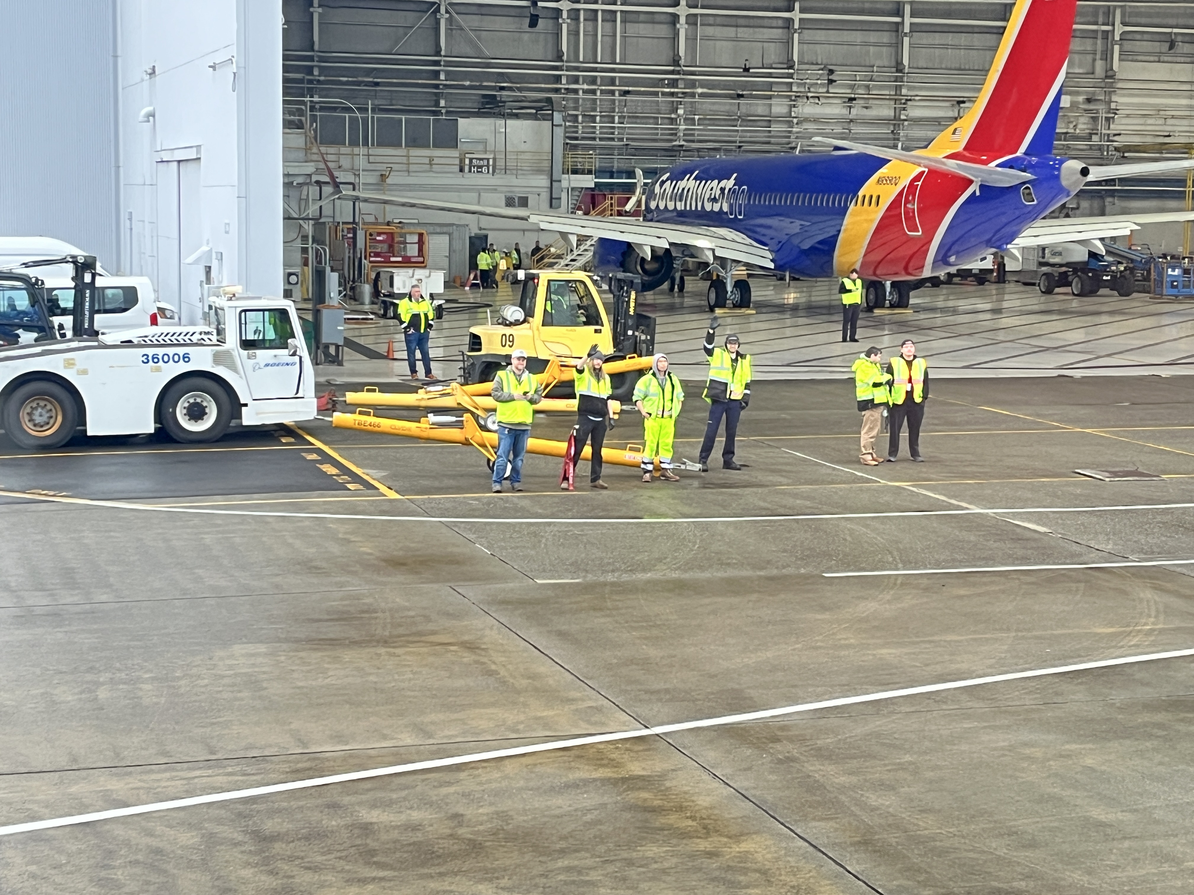 Winkende Boeing-Mitarbeitende verabschieden die G-TUPE vor dem Abflug nach Manchester. aeroTELEGRAPH