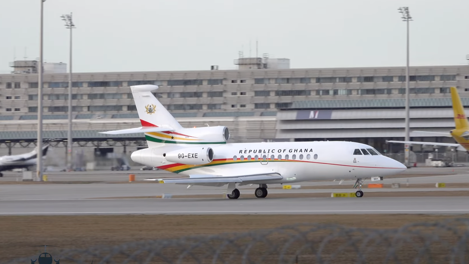 Der westafrikanische Staat betreibt seit 15 Jahren eine Dassault Falcon 900EX als Präsidentenmaschine. Der Jet für 16 Personen mit der Kennung 9G-EXE startete am 11. März zum 24-Montascheck zu Dassault Falcon Service nach Le Bourget. Eigentlich wurde das Flugzeug zwei Wochen später in Accra zurückerwartet.