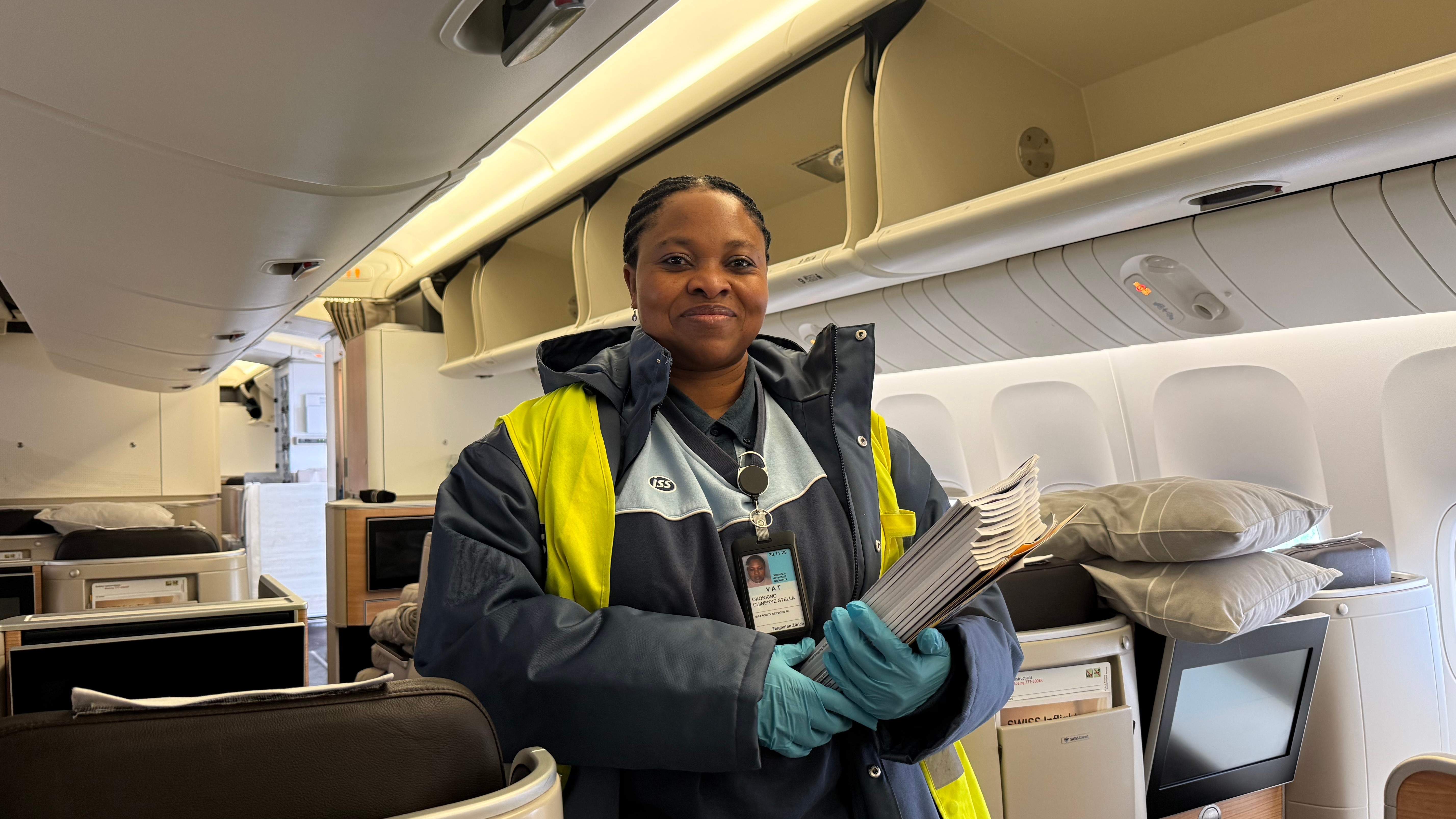 Das prüft Stella Okonkwo Chinenye – hier kontrolliert sie in der Business Class jeden einzelnen Sitz.