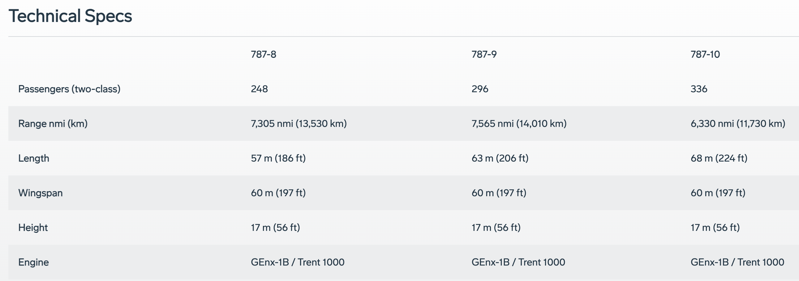 Doch warum ist die mittelgroße Variante so viel beliebter als die anderen beiden? Um das zu verstehen, lohnt sich ein Blick auf die Basis-Daten der drei Versionen der Boeing 787: