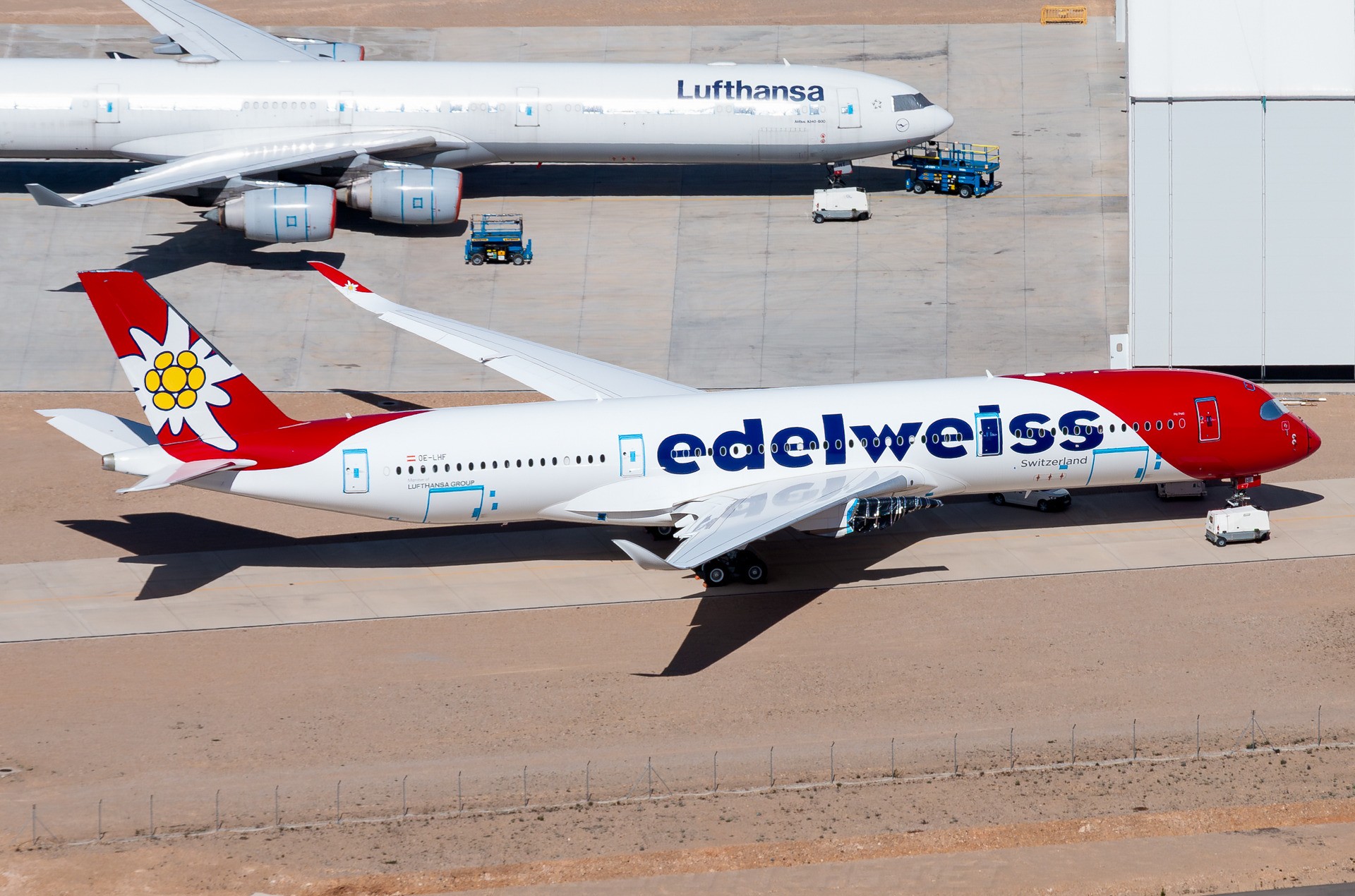Foto aus Teruel im April 2025: Hinter dem Airbus A350 von Edelweiss steht die D-AIHT. Juan Manuel Gibaja / planespotters.net