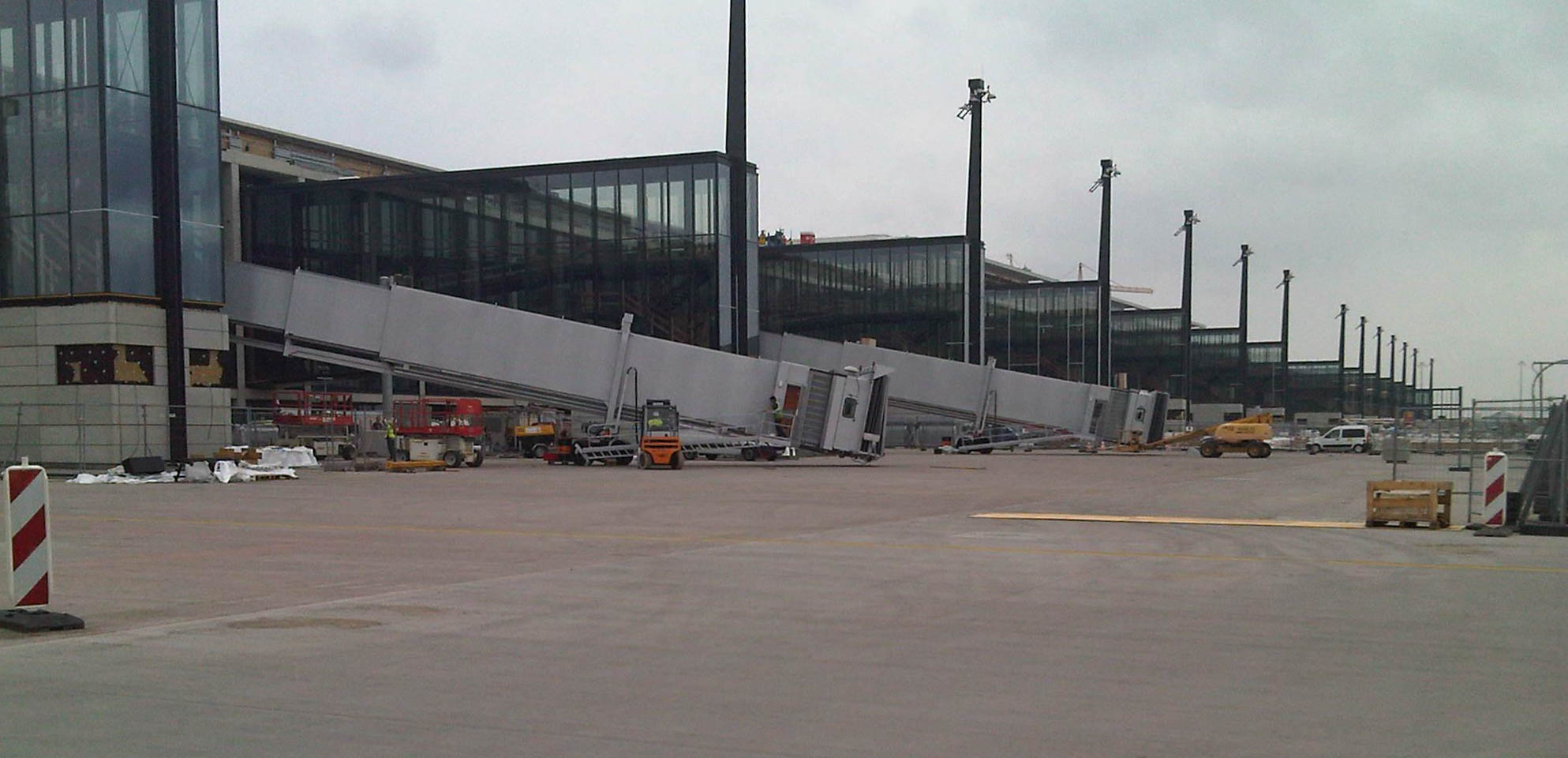 Montage der ersten Fluggastbrücken im Juli 2011: Bereits im Vorjahr wurde der Eröffnungstermin vom 30.Oktober 2011 auf den 3. Juni 2012 verlegt. Im Winter 2011 wurden erste Probleme um die Brandschutzanlagen bekannt - es folgte eine jahrelange Pannenserie.
