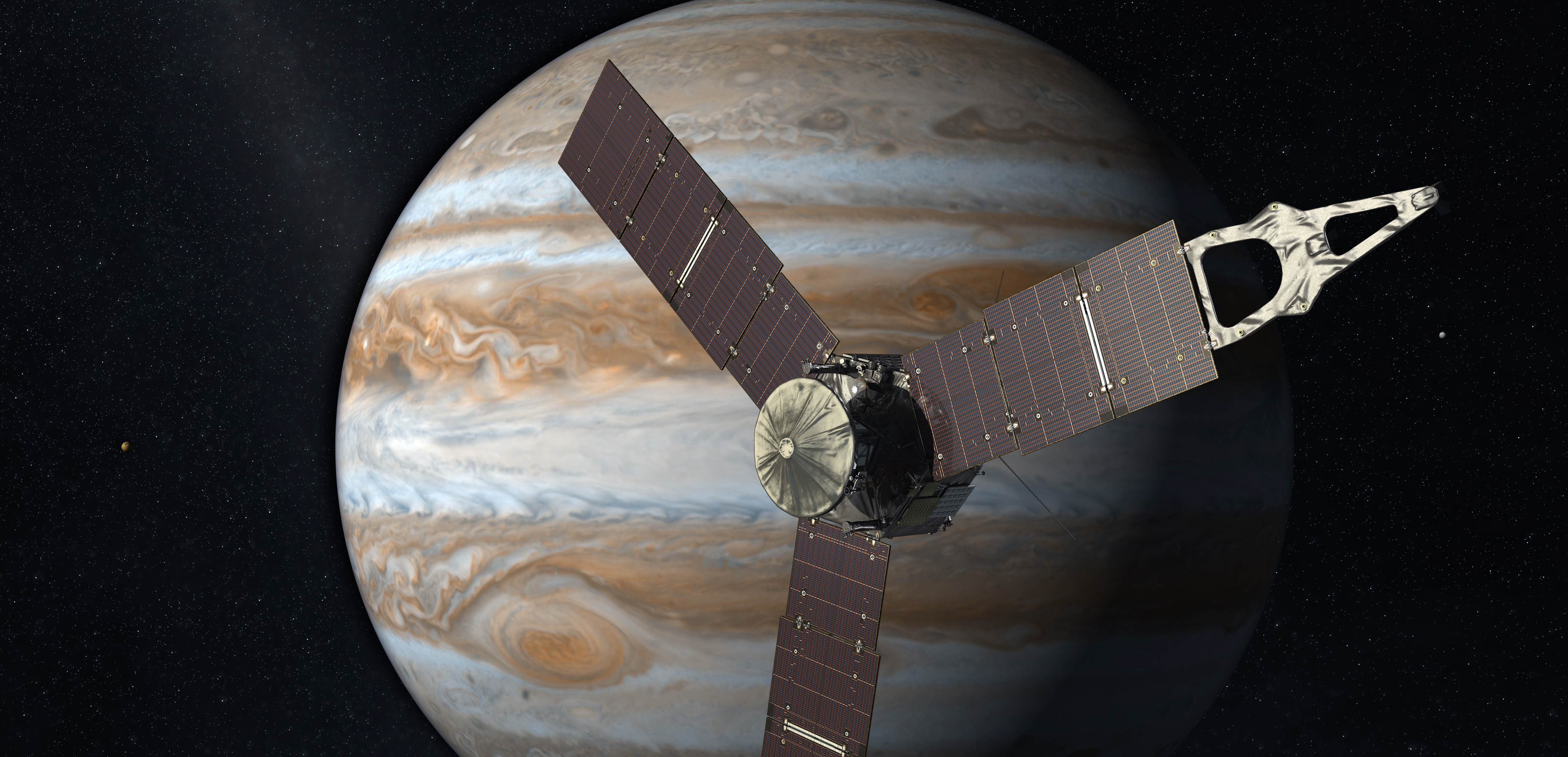 Computerskizze der Raumsonde Juno: Die Sonde startete im August 2011 zum Jupiter. Nach etwa 2,8 Milliarden Kilometern Flugstrecke erreichte die Sonde den Gasriesen im Jahr 2016.
