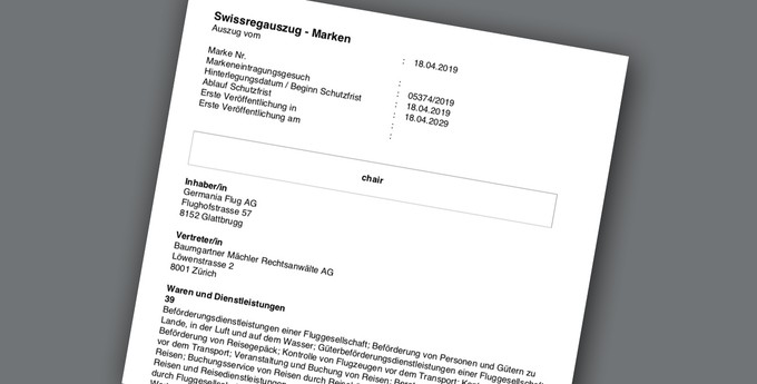Offenbar ist nun eine Entscheidung gefallen. Germania Flug ließ am 18. April die Marke «chair» im schweizerischen Register eintragen (siehe Auszug unten). Verwendungszweck: «Beförderungsdienstleistungen einer Fluggesellschaft». Ch steht dabei wohl für die lateinische Landesbezeichnung Confoederatio Helvetica, die mit CH abgekürzt und etwa im Auto- oder Postverkehr verwendet wird. Was chair geschrieben wird, würde also eher als CH Air interpretiert. Bildmarken wurden bisher keine eingetragen.