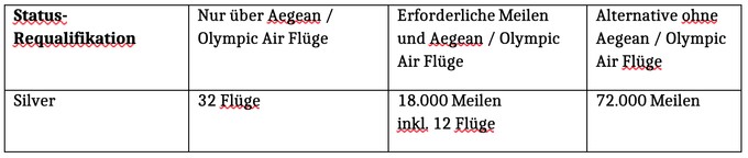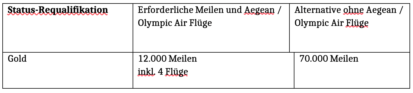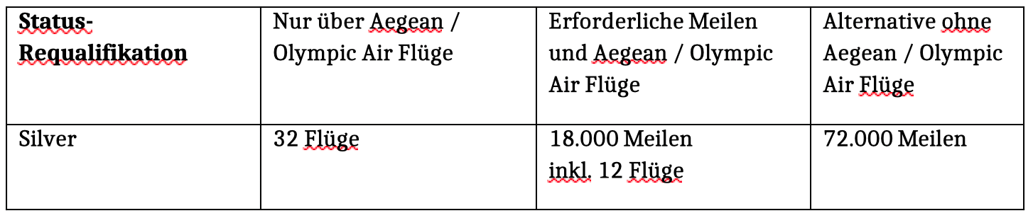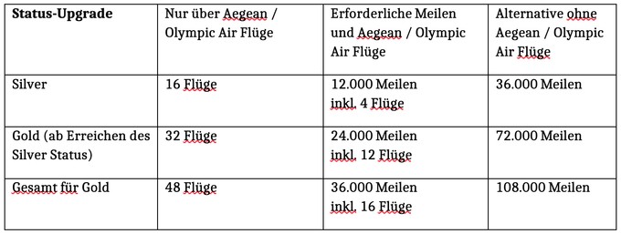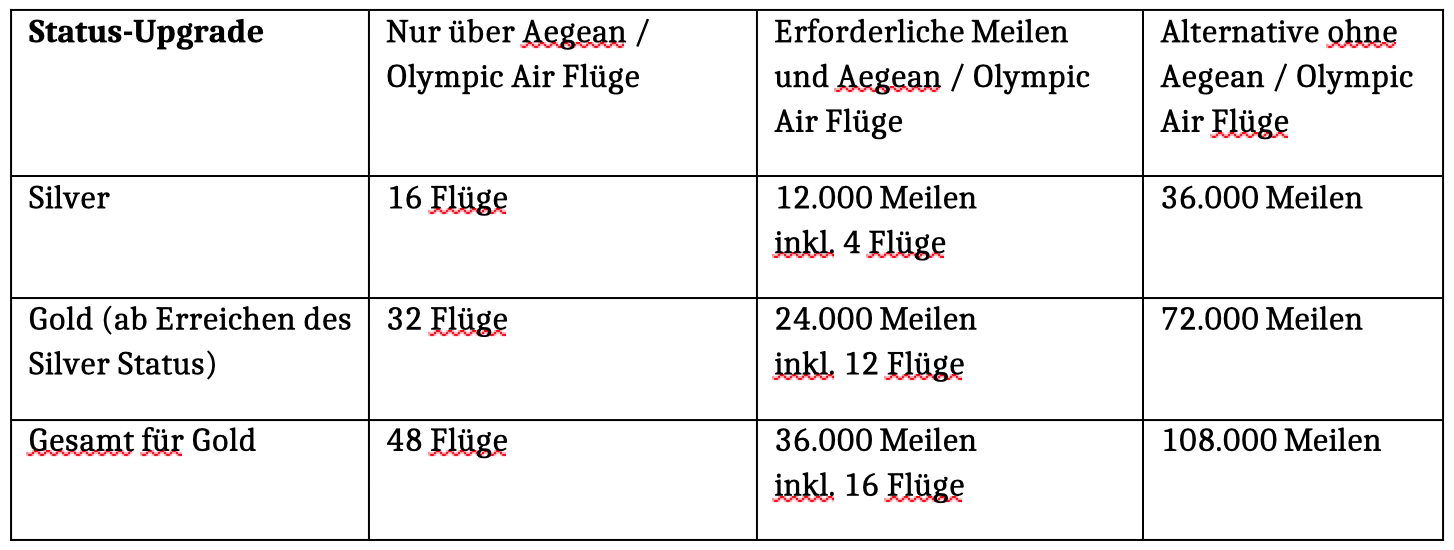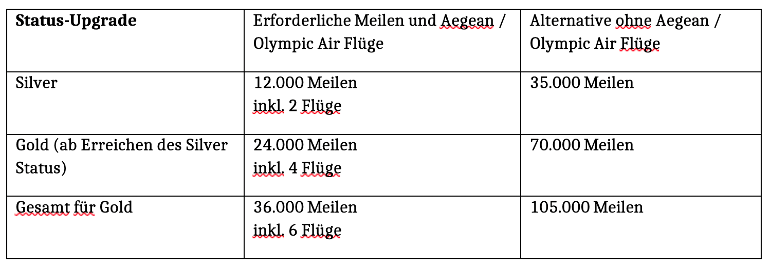 Selbst die Requalifikation für Gold erfordert künftig 32 Flüge mit Aegean oder Olympic Air oder alternativ 18.000 Meilen plus zwölf Aegean-Flüge – das entspricht etwa drei Griechenland-Reisen pro Jahr über Athen zu einem Ziel innerhalb Griechenlands, da man dabei jeweils automatisch vier Flugsegmente sammelt.