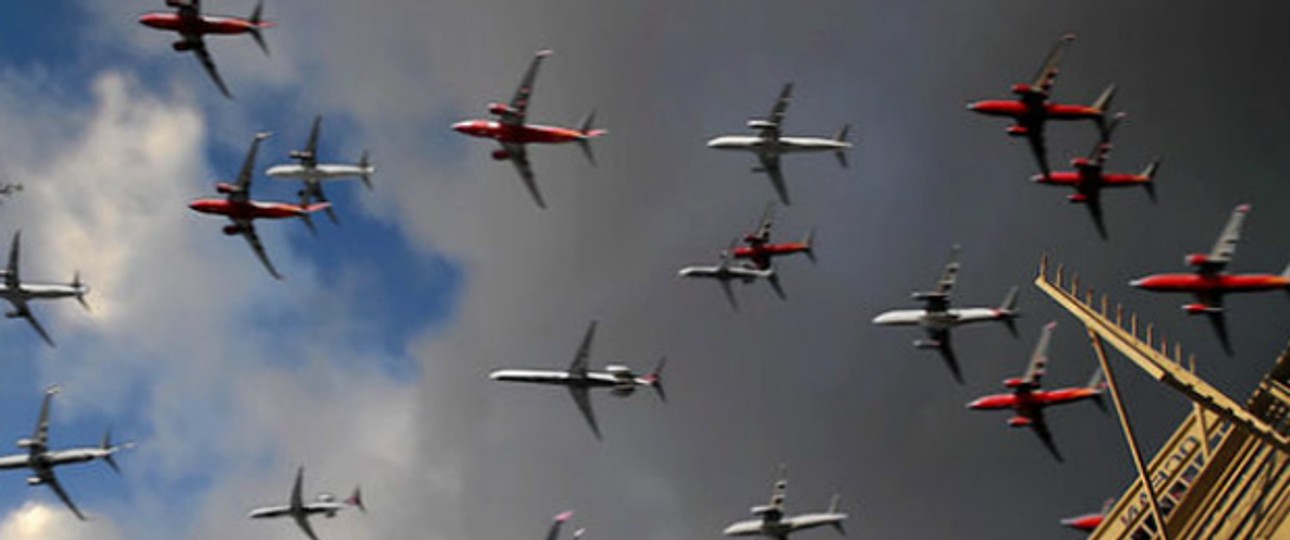 Fünf Stunden lang hielt Fotograf und Filmprofessor Cy Kuckenbaker Flieger mit seiner Kamera fest, die in San Diego starteten und landeten. 90 Stück schafften es so in sein neustes Werk. Mit einer komplizierten Technik legte er die verschiedenen Spuren dann so übereinander, dass alle Maschinen, die er beobachtet hatte, innerhalb von nur 30 Sekunden erscheinen. Ein bisschen erinnern die Flugzeuge an einen Vogelschwarm, der sich auf die lange Reise in den Süden aufmacht.