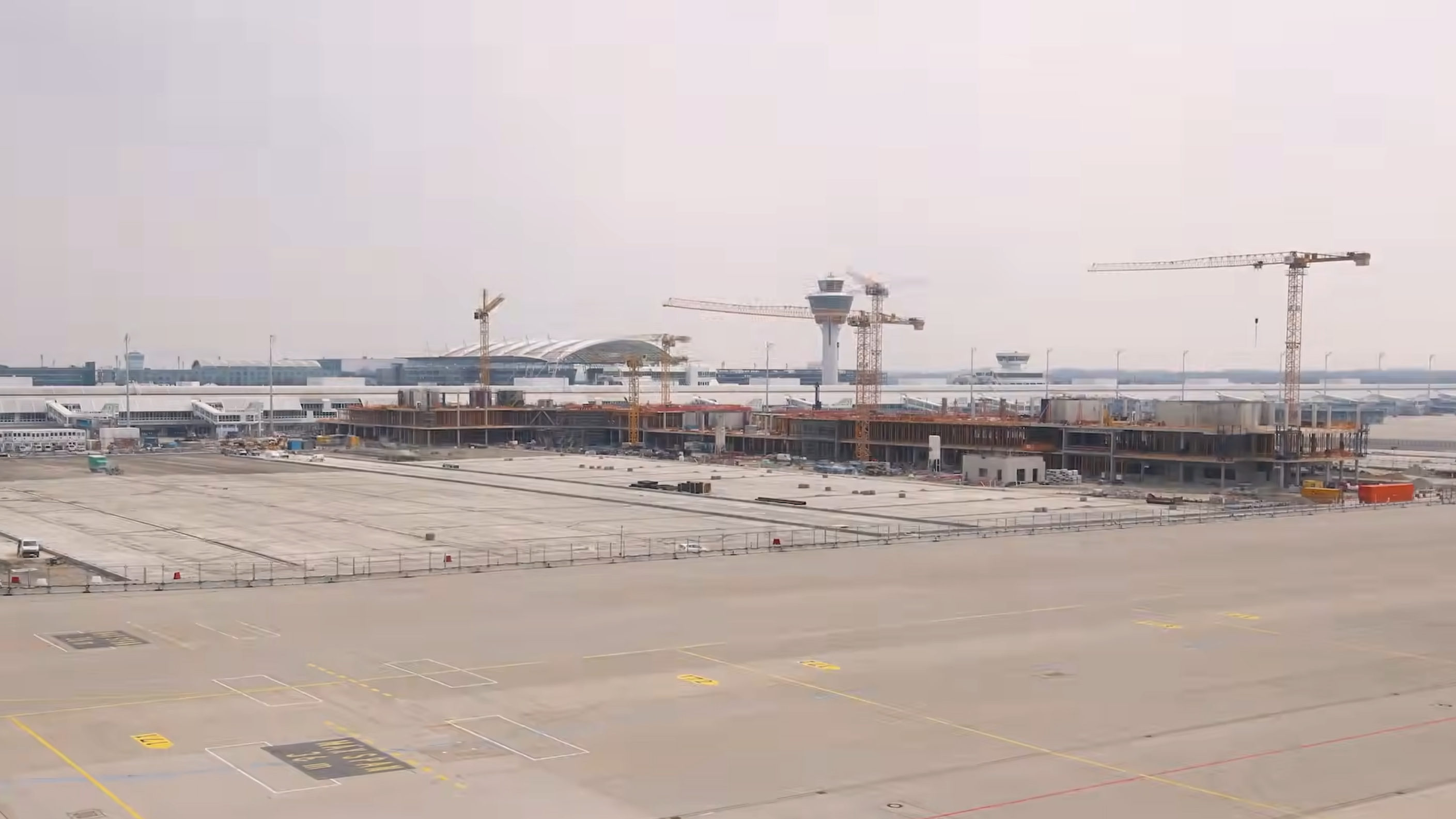In München entsteht seit 2019 ein neuer, 95.000 Quadratmeter großer Pier am Terminal 1. Ende April geht der Bau ans Netz. Ein Zeitraffervideo zeigt sieben Jahre Bauarbeiten in 76 Sekunden.