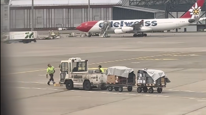 «Hier spricht der Kapitän. Wir haben noch nicht unsere endgültige Parkposition erreicht. Ein Gepäckwagen hat ein paar Päckchen verloren, die sie jetzt einsammeln müssen. Wir danken für Ihre Geduld». Unklar ist, um welchen Flug es sich handelte und von wann genau das Video stammt, ist unklar.