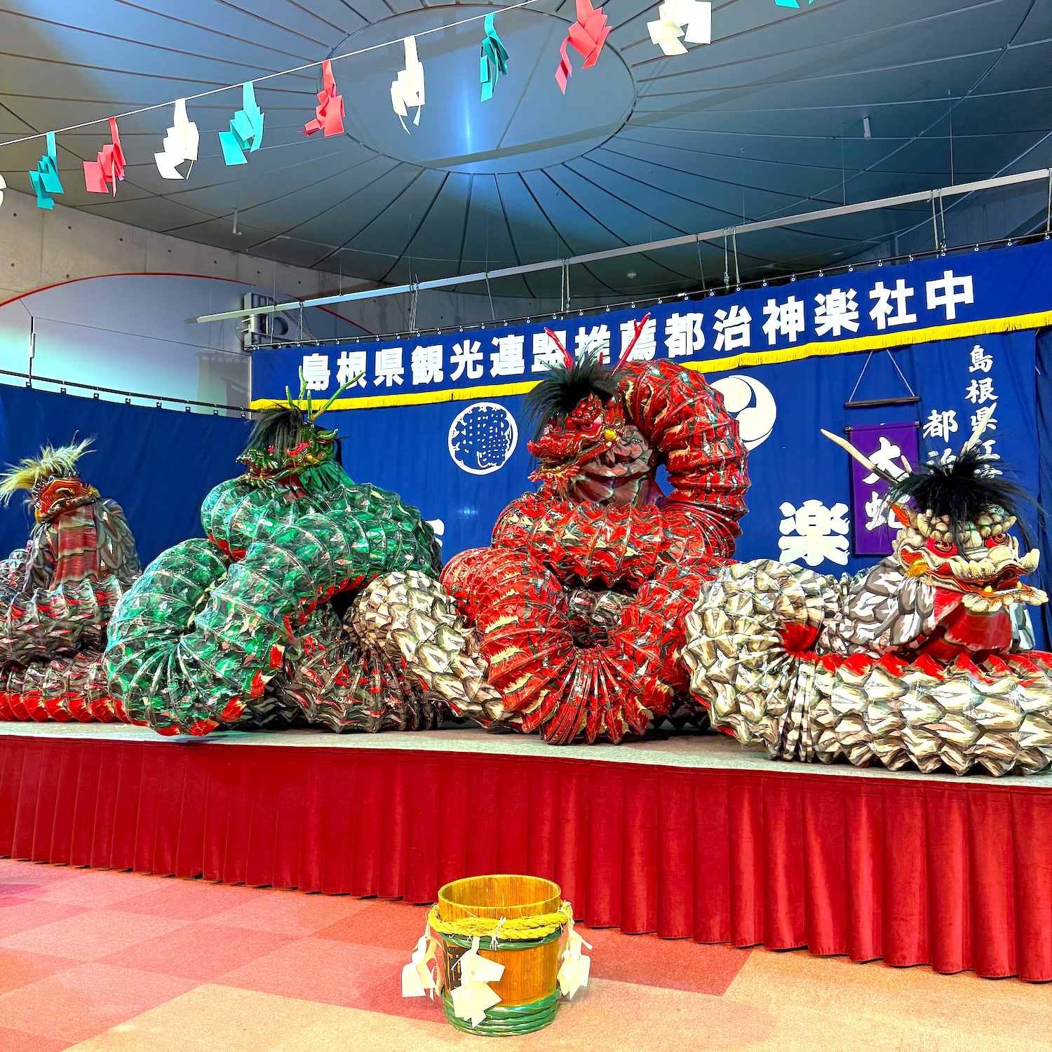 Das regionale Iwami Kagura ist wilder, lustiger, schneller, humorvoller und lauter als die konventionellen Kagura-Vorführungen. Das Besondere: Die Musiker und Tänzer stecken hinter kunstvollen Masken aus Washi-Papier und riesigen Schlangenkörpern, die ebenfalls aus lokal produziertem Washi-Papier gefertigt sind.