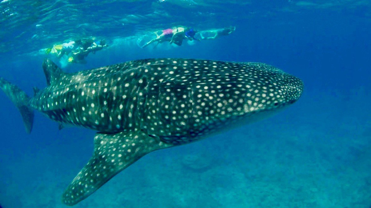 Daher sind wir glücklich, diesen Ort noch ein zweites Mal und mit deutlich weniger Verkehr erleben zu dürfen. Diesmal sind gerade mal zehn, 15 Menschen mit uns gleichzeitig im Wasser – und der Walhai diesmal nicht nur viel höher schwimmend, nämlich fast unter der Wasseroberfläche, sondern auch deutlich größer: satte acht Meter, eine stattliche Größe für diese Region, wo sich vor allem jugendliche Walhai-Männchen aufhalten. Und er kommt sehr nah. Kaum sind wir ins Wasser gehüpft und die Blasen des Reinspringens ein wenig verflogen, merken wir, dass wir direkt in der Bahn des Giganten schwimmen!