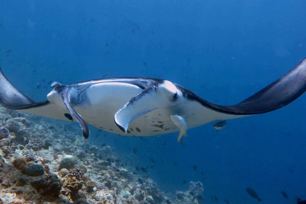 Heute sind wir nur zu sechst. Plus drei Mann Besatzung und Katie, die bei der Fahrt über das ruhige Meer viel Interessantes über die Fauna des Atolls erzählt und dies mit einer Reihe von Fotos und informativen Grafiken untermalt. Nach einer Stunde schließlich werden auffällige Bewegungen an der Oberfläche entdeckt – entsprechende «Manta, Manta»-Rufe bringen alle Schnorchler in Position. Dann geht alles ganz schnell. Brille auf, Schnorchel in den Mund und ins Wasser gehüpft. Und nach ein paar Momenten der Orientierungssuche sehen wir sie: zwei Mantas, die in gerade einmal zehn Meter Entfernung ganz langsam an uns vorbeiziehen.
